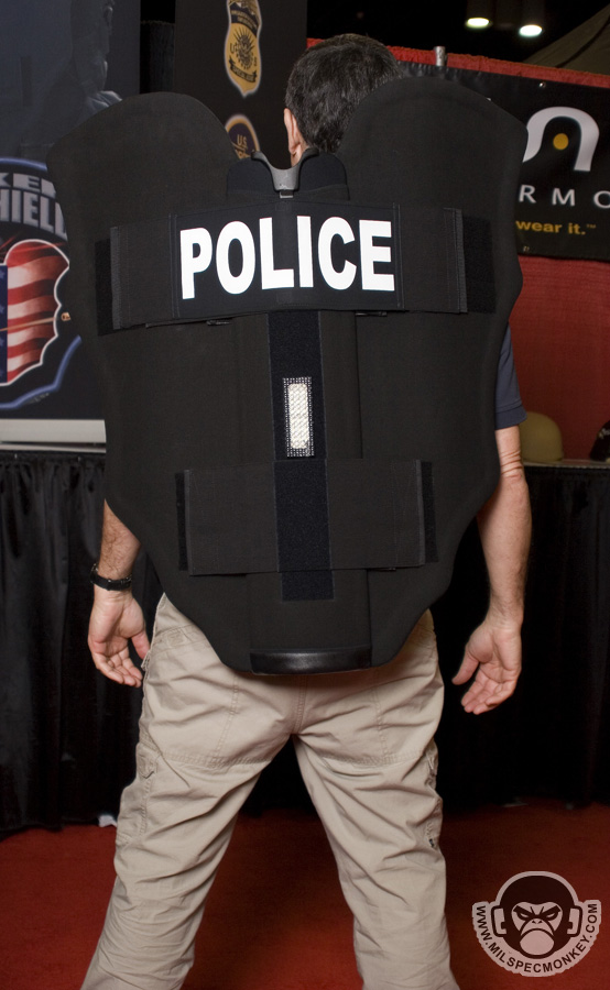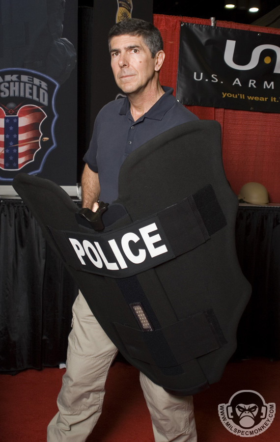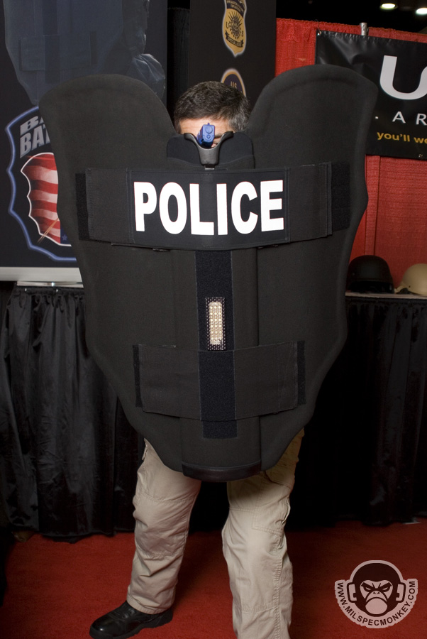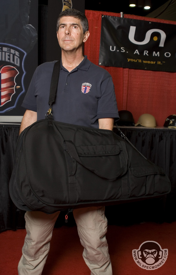 Saw this while browsing the showfloor, got to see a demo and was impressed how well thought out it was. Comes with a bag that can be used for more compact / discreet carry or just in your vehicle for added protection. From the bag the shield can quickly be deployed out and into full form. The shield is light enough to quickly sling over to one's back when both hands are needed. A weapon slot is standard and front LED light options are available. Shield comes in 2 sizes of 9lb compact and 12lb full. Be sure and check out his site for plenty more intel and quality videos.