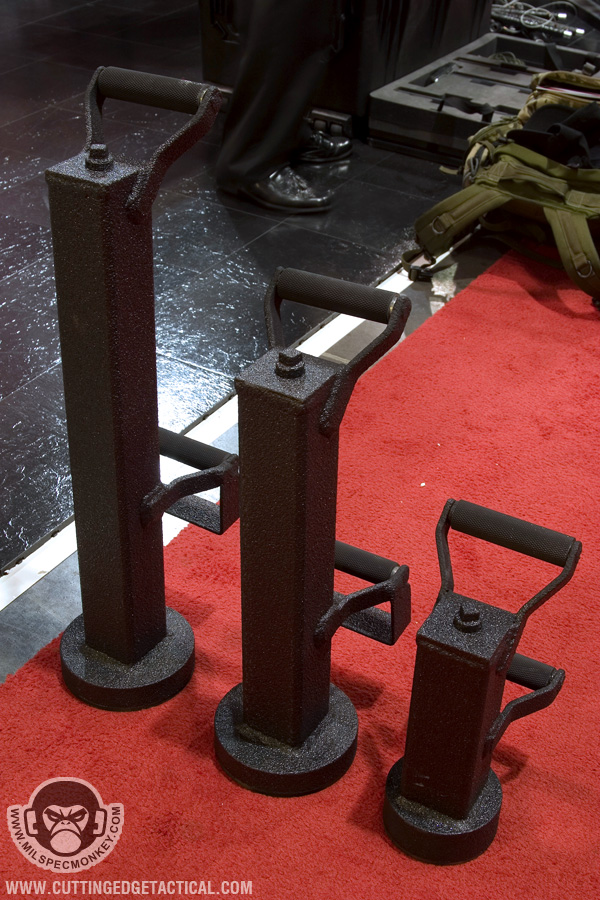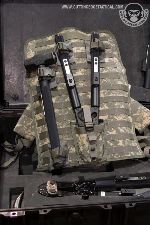 CET specializes in heavy duty gear for the more "rough" tasks of tactical operations. Starting off with the door rams, they look simple offhand, but work great with rollers on the handles. This allows for the classic door busting movements to be performed as easy as possible. 3 sizes are available and it appeared all could have extra weight added through a bolt hole. Most of the ladder systems consist of a simple, but effective joint cover system and range from double pole to single with steps. Not shown was an awesome hook and pole ladder that broke out into a cargo style ladder. I hope to have a video demo later. Also available were almost all the classic manual breaching tools in collapsible form. Using a heavy duty spring lever, the tools can be deployed from compact 17" to 28" extended with gravity. Tolerances are loose to keep smooth operations in harsh environments. I'm keeping things a little vague here since I have 2 great video demos available: