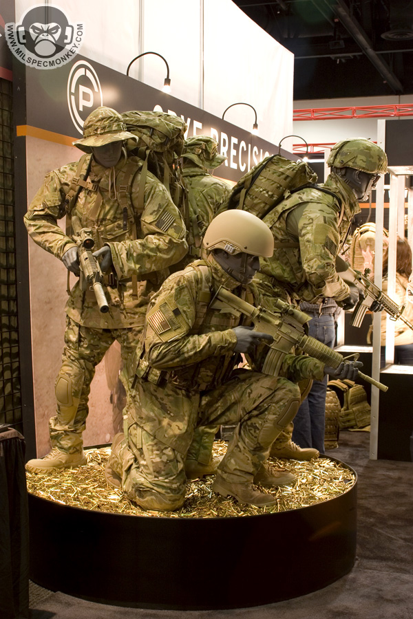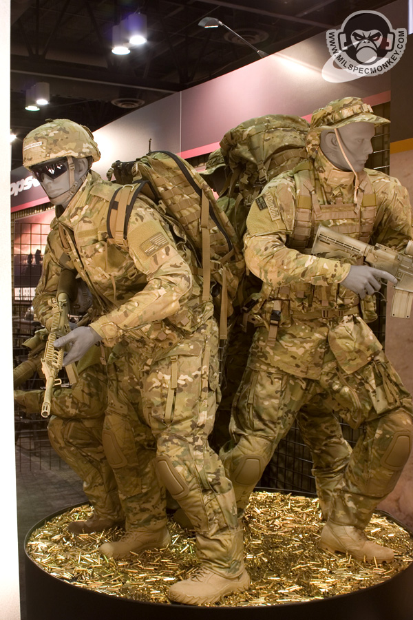 Crye had some interesting updates to their already innovative products. The new combat pants and shirt have been slimmed down for weight, but kept their main features such as integrated pads. The pants had some interesting stretch panels I had not seen before and shirt will now be made with Drifire for the main torso area which is great wicking / anti-flame material. I couldn't take pictures, but the revised Crye plate carrier was on display. They toned down all the hardware, so it looks more like a current plate carrier, however is still has most of the previous features. The stock locks are gone, and the plates are inserted by more traditional means. Also shown were a couple of items for examples of Multicam water transfer printing. Enough of my blabbn' check out the video demo: