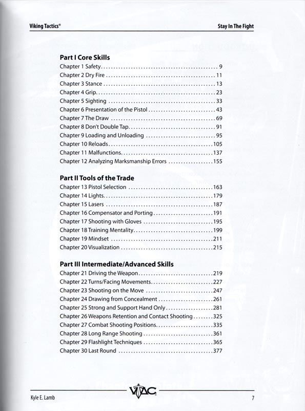 Having trained with Viking Tactics before it is a pleasure to see nothing is dumbed down in this book. The Intel inside is the same potent training as a full on class. Of course an in person class will be an enhanced learning experience, however Stay In The Fight offers great bang for the buck. The key is certainly being able to find range time to exercise all the topics covered to really put the knowledge into practice. That said, a huge amount can still be accomplished practicing dry fire. Stay in The Fight is structured specifically for combat pistol and not competition / target shooting so you need not worry about techniques being presented that only work when you are sitting behind a bench with a sandbag handy.