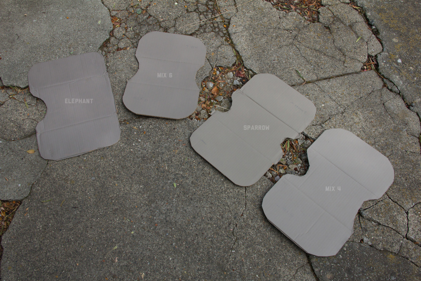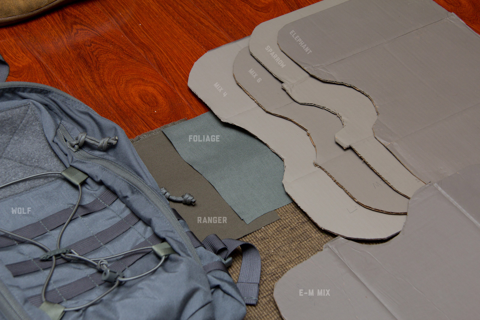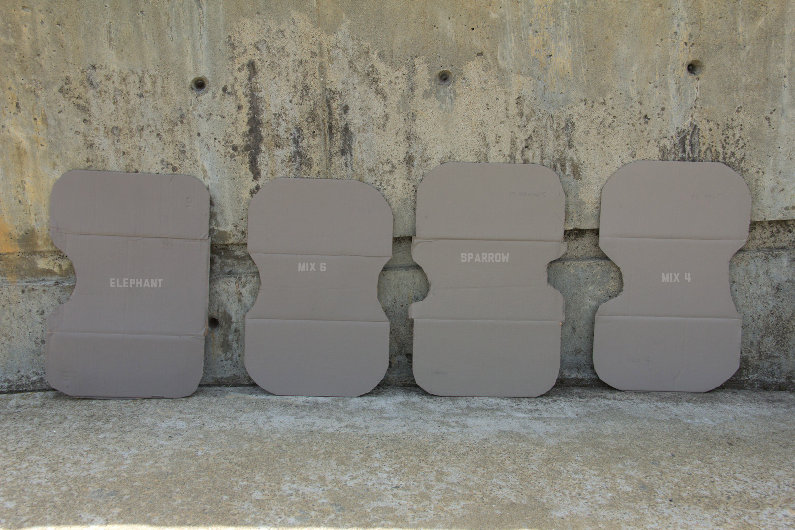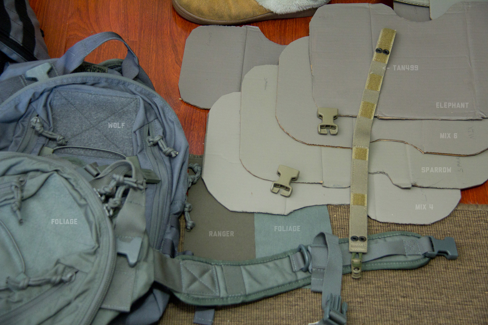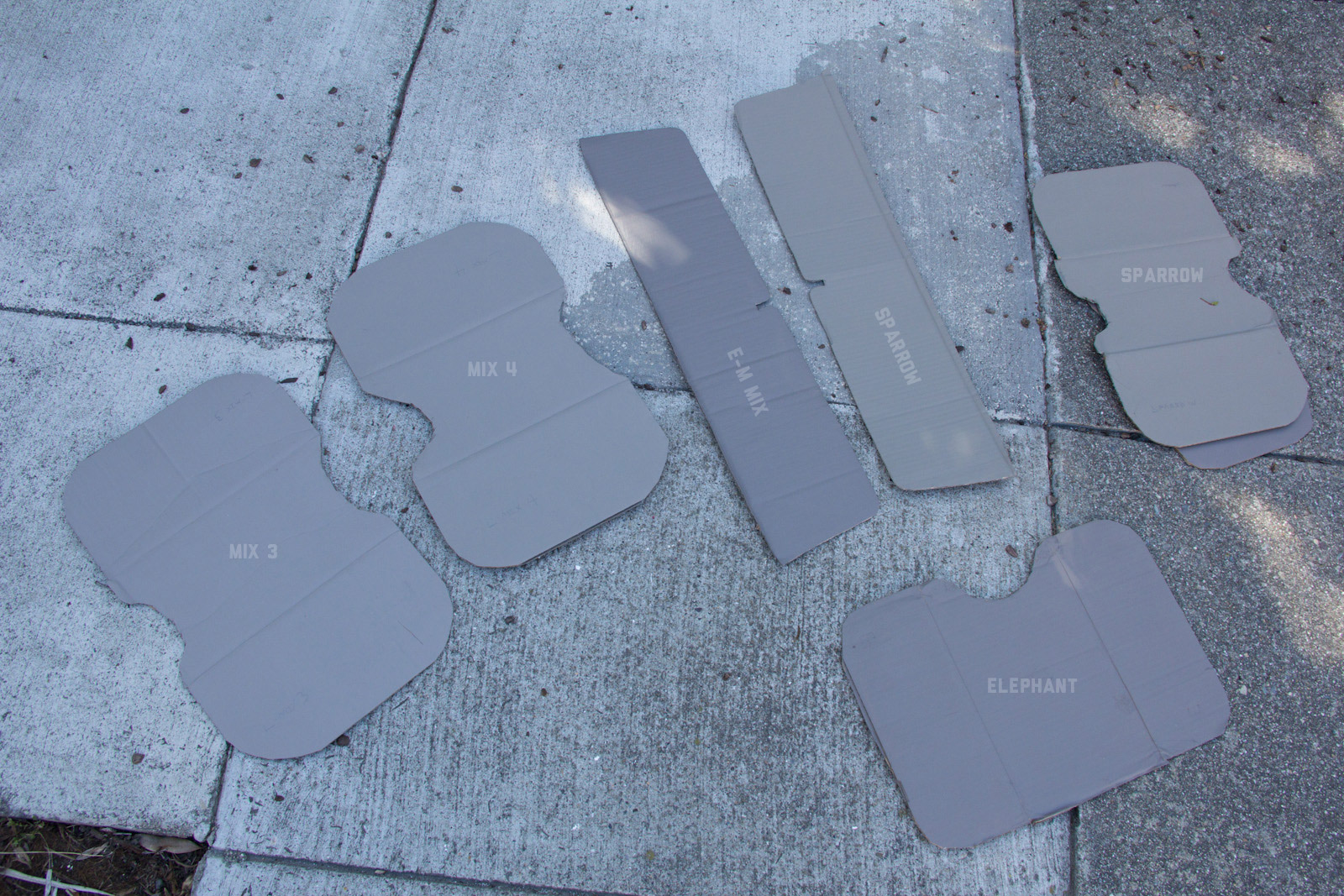 After a lot of back and forth on mixing and documenting, I narrowed things down to Elephant/Fauna, Mix6, Sparrow, and Mix4. The differences were getting pretty darn subtle which perhaps is a sign of good progress. Elephant leans towards the darker side, and although a smidge too much red it still looks good in a lot of places. Mix6 seems like a solid middle ground so far on the concrete spectrum, yet is still brighter than most tac colors in use. Going a little more light, sparrow also is in the middle zone and the slight green usually does more good than bad. Then finally Mix4 leans on the lighter end as a good neutral color, which of course makes it more susceptible to contrasting on darker colors.