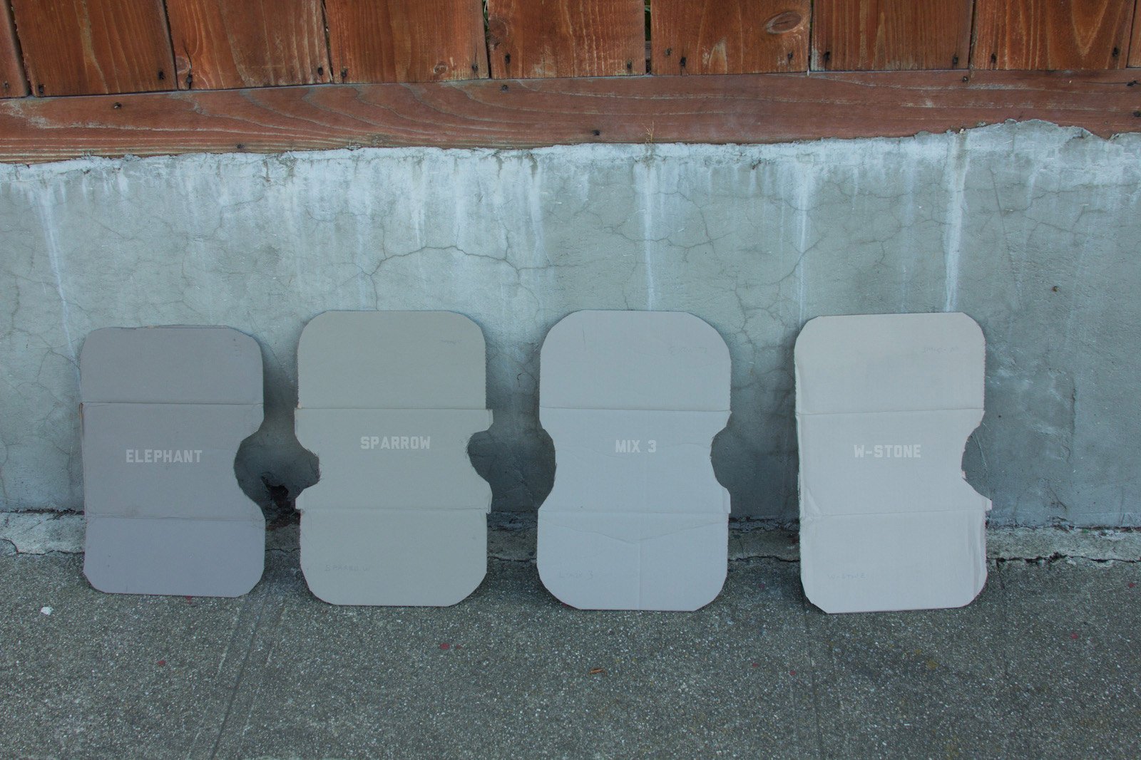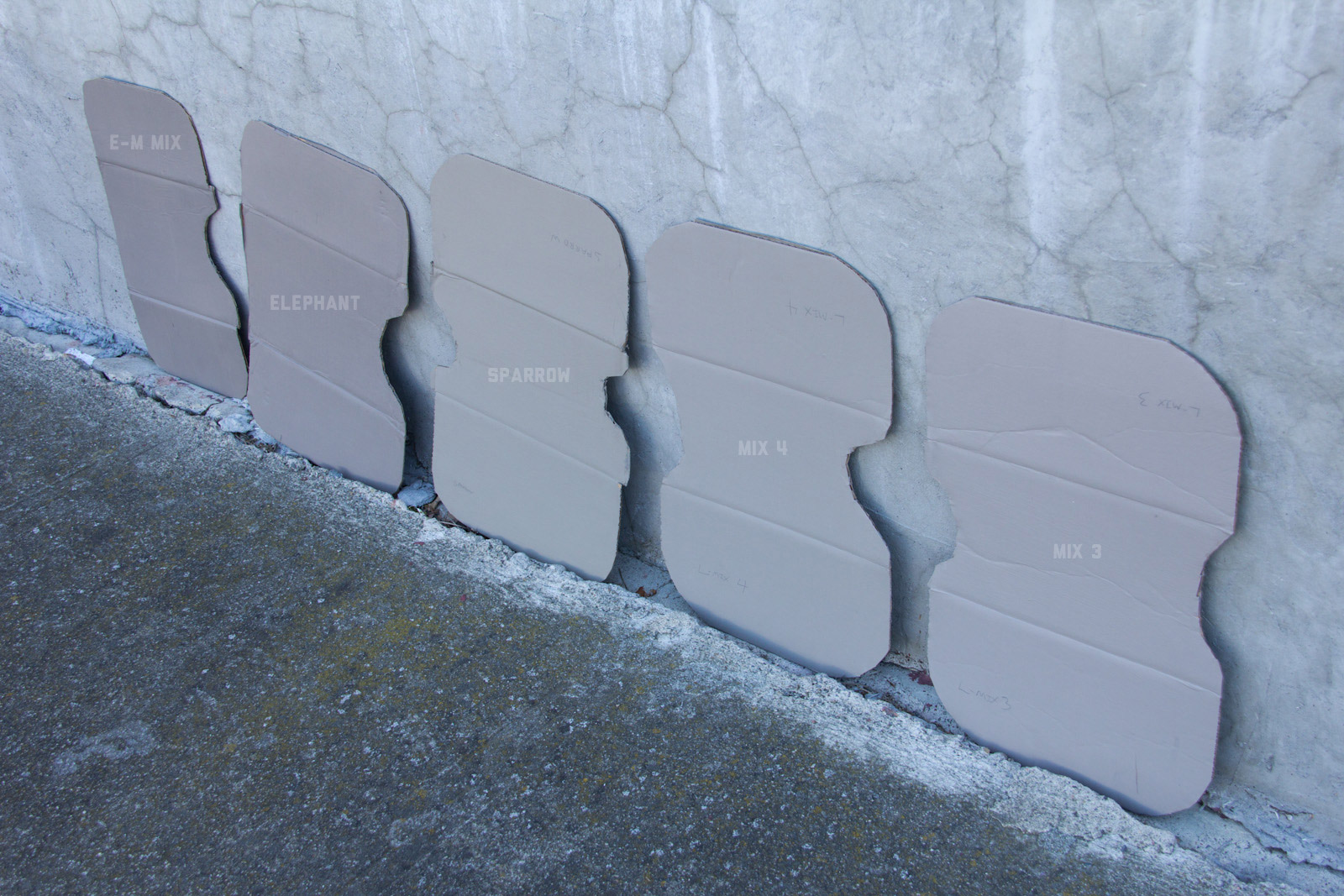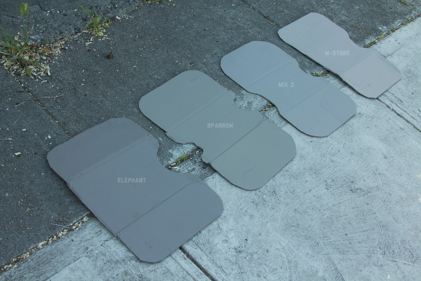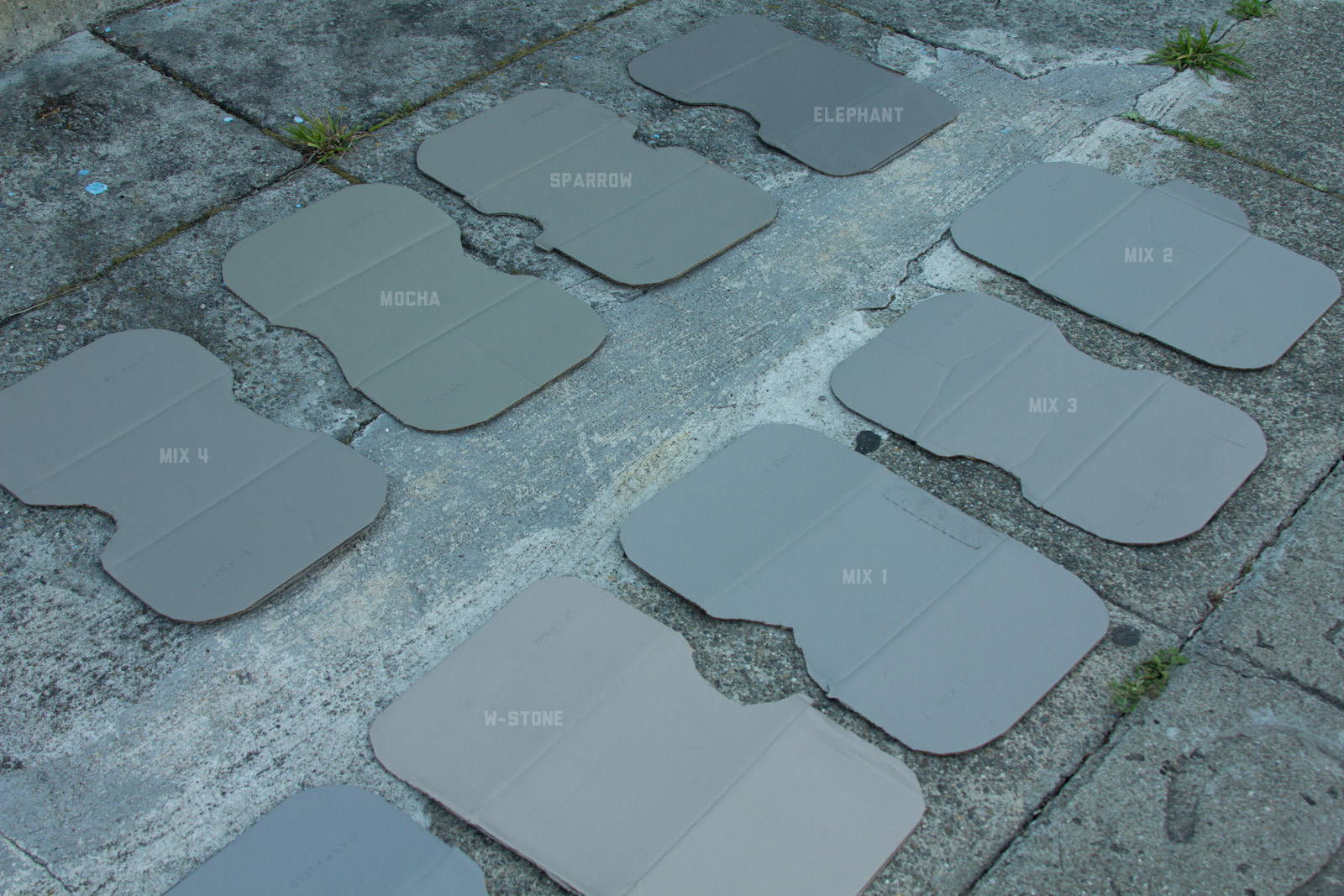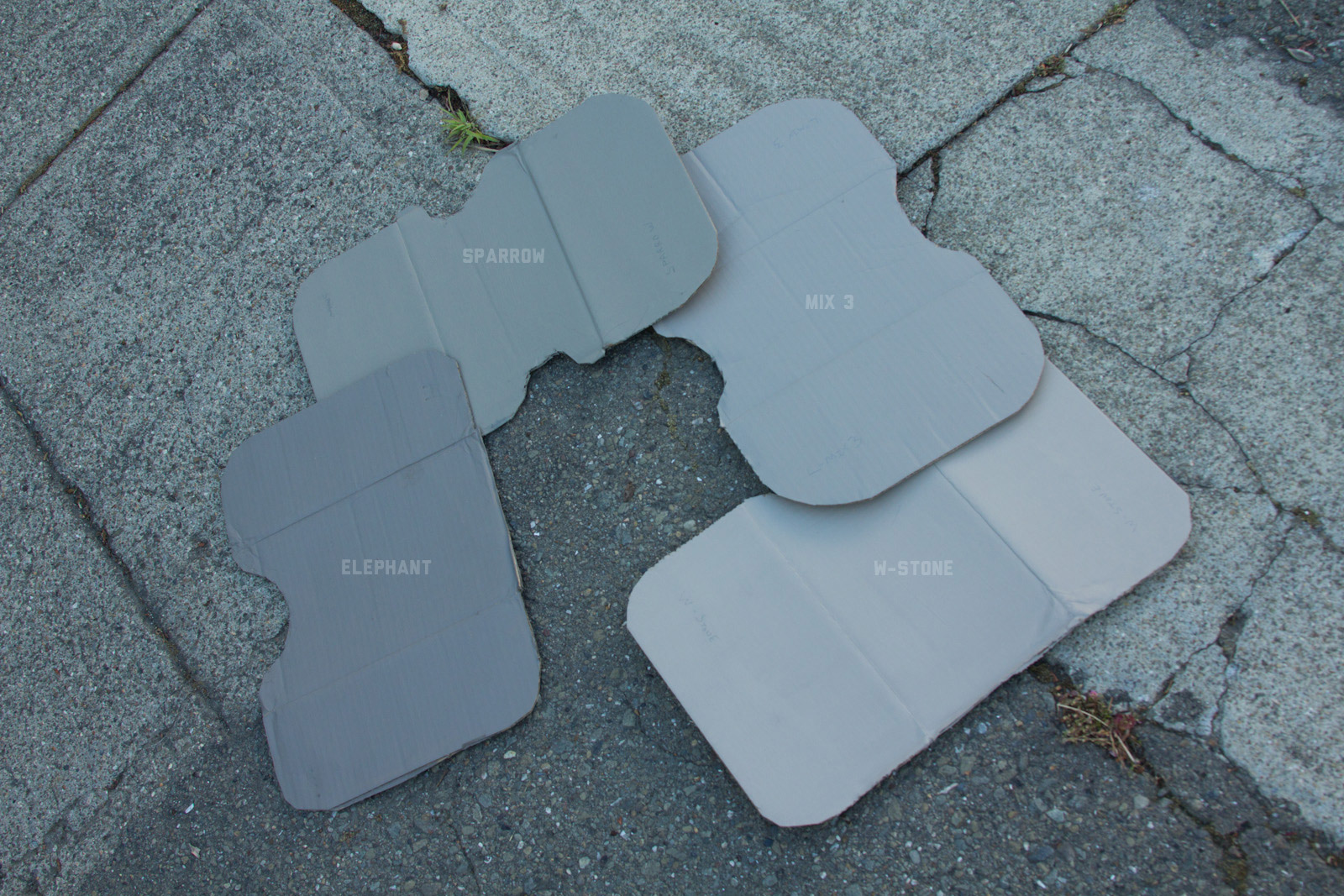 After some good feedback on this article I took the advice to try and investigate more concrete walls. As it turns out, most unpainted walls in my area are wicked bright, Pantone wise coming in around: 402 - 403, 7529 - 7530, WarmGrey 6 - WarmGrey 8, 7536 (on lighter end). I had my doubts hearing Crocodile (basically a desert tan) was being used in urban night ops, but after testing some lighter walls this made more sense. Based on this I got Wright Stone Tan 10YY 30/106 - card WN25 Glidden at Home Depot to add some lighter options to my testing. Instead of just small samples I also moved on to larger samples by painting cardboard chunks. For a more middle tone for my pile I also picked up Sparrow AF-720 by Benjamin Moore along with Brimfield RL4352 Ralph Lauren Paint, mostly as a light grey to mix with. By this time I dropped Mercer for looking too cool on most tests and in a bigger size the Fauna/Elephant had a little too much red, but was still good enough to keep around. Since Wright Stone Tan was going to be too rowdy on its own, I ended up with Mix4 for lighter end testing for a while. Despite enjoying sparrow for a light middle, it was showing just a little more green than wanted so after a couple more mixes I found Mix6 to be a nice result, being the middle of Elephant and Sparrow. I briefly tried Mocha, a color that looked good on the sample card, but with testing ended up pretty green.