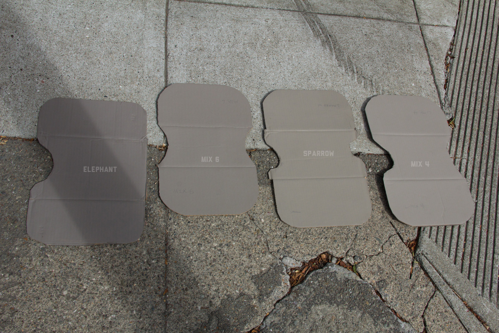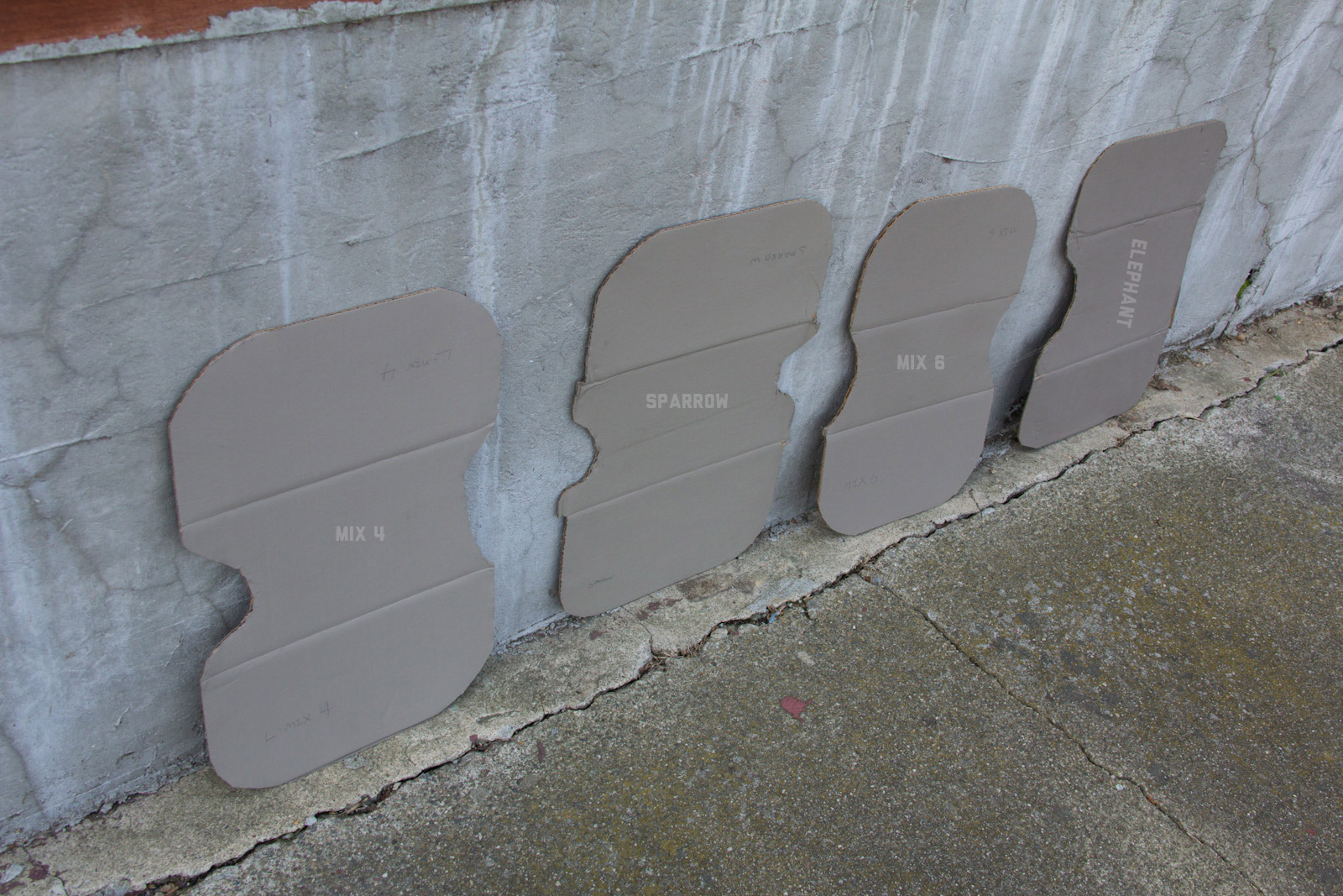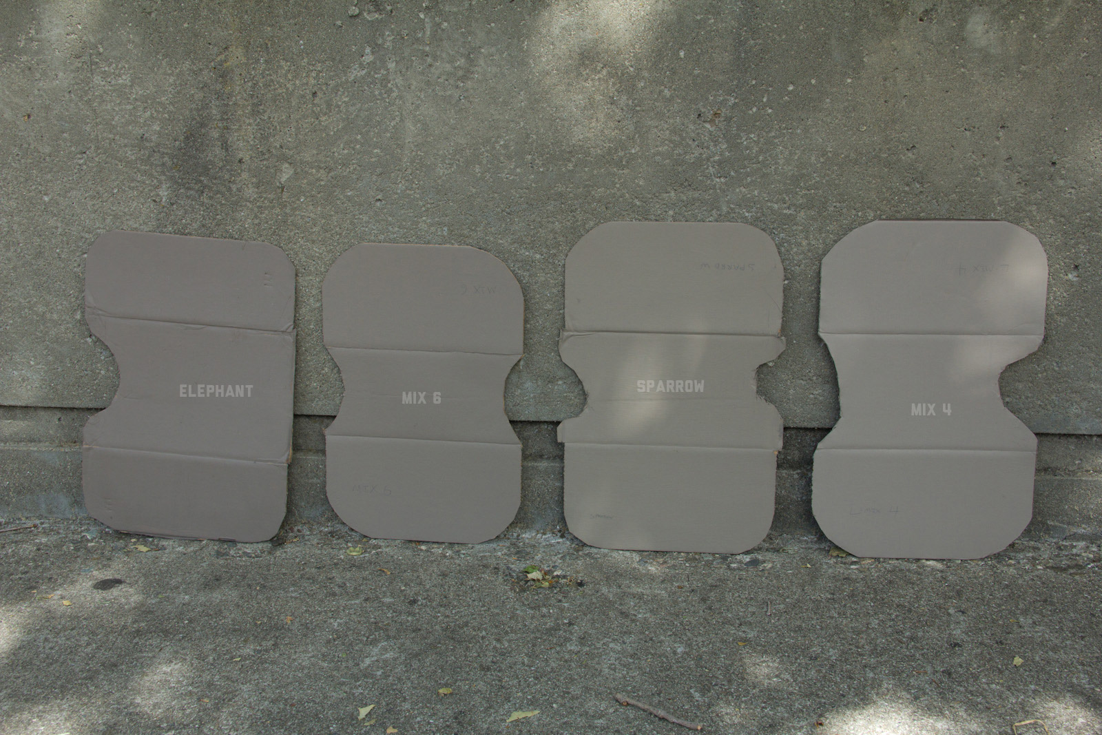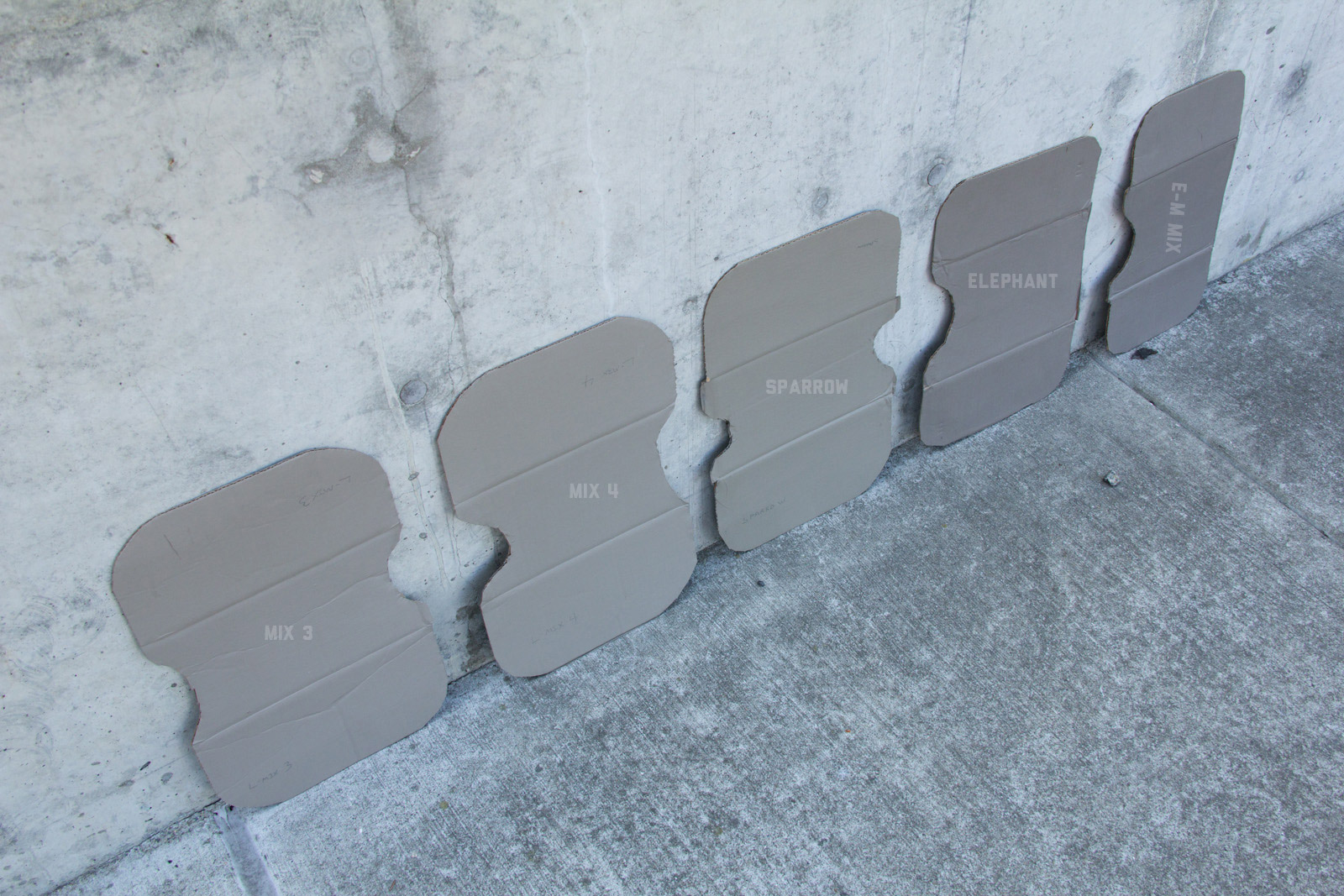 After some good feedback on this article I took the advice to try and investigate more concrete walls. As it turns out, most unpainted walls in my area are wicked bright, Pantone wise coming in around: 402 - 403, 7529 - 7530, WarmGrey 6 - WarmGrey 8, 7536 (on lighter end). I had my doubts hearing Crocodile (basically a desert tan) was being used in urban night ops, but after testing some lighter walls this made more sense. Based on this I got Wright Stone Tan 10YY 30/106 - card WN25 Glidden at Home Depot to add some lighter options to my testing. Instead of just small samples I also moved on to larger samples by painting cardboard chunks. For a more middle tone for my pile I also picked up Sparrow AF-720 by Benjamin Moore along with Brimfield RL4352 Ralph Lauren Paint, mostly as a light grey to mix with. By this time I dropped Mercer for looking too cool on most tests and in a bigger size the Fauna/Elephant had a little too much red, but was still good enough to keep around. Since Wright Stone Tan was going to be too rowdy on its own, I ended up with Mix4 for lighter end testing for a while. Despite enjoying sparrow for a light middle, it was showing just a little more green than wanted so after a couple more mixes I found Mix6 to be a nice result, being the middle of Elephant and Sparrow. I briefly tried Mocha, a color that looked good on the sample card, but with testing ended up pretty green.