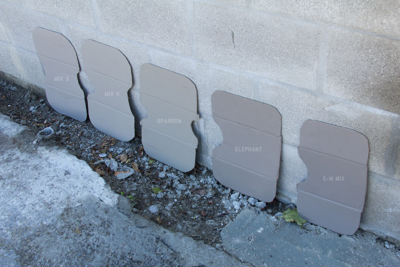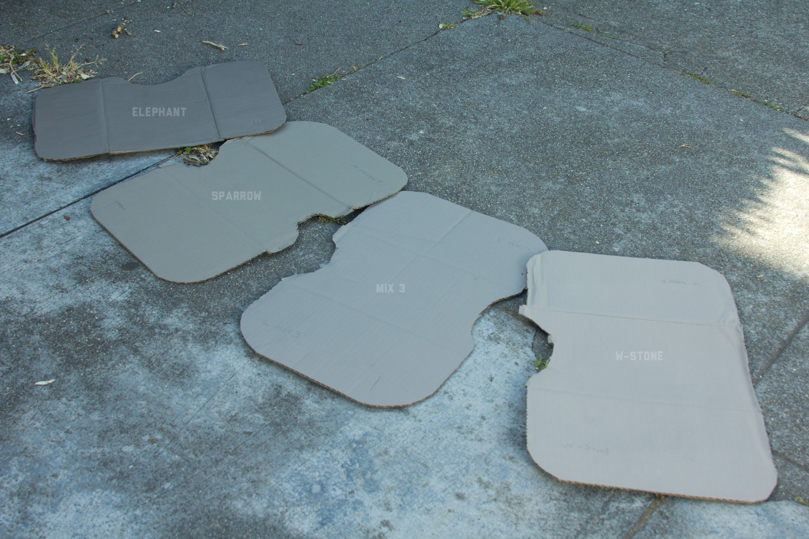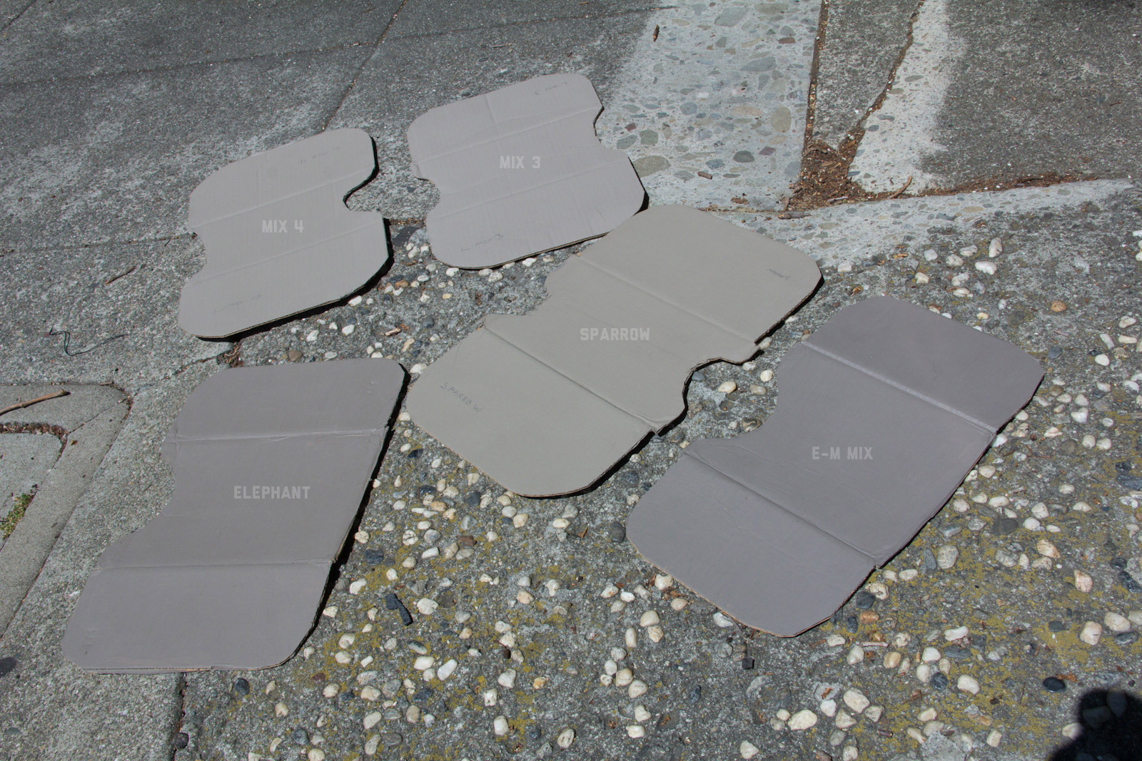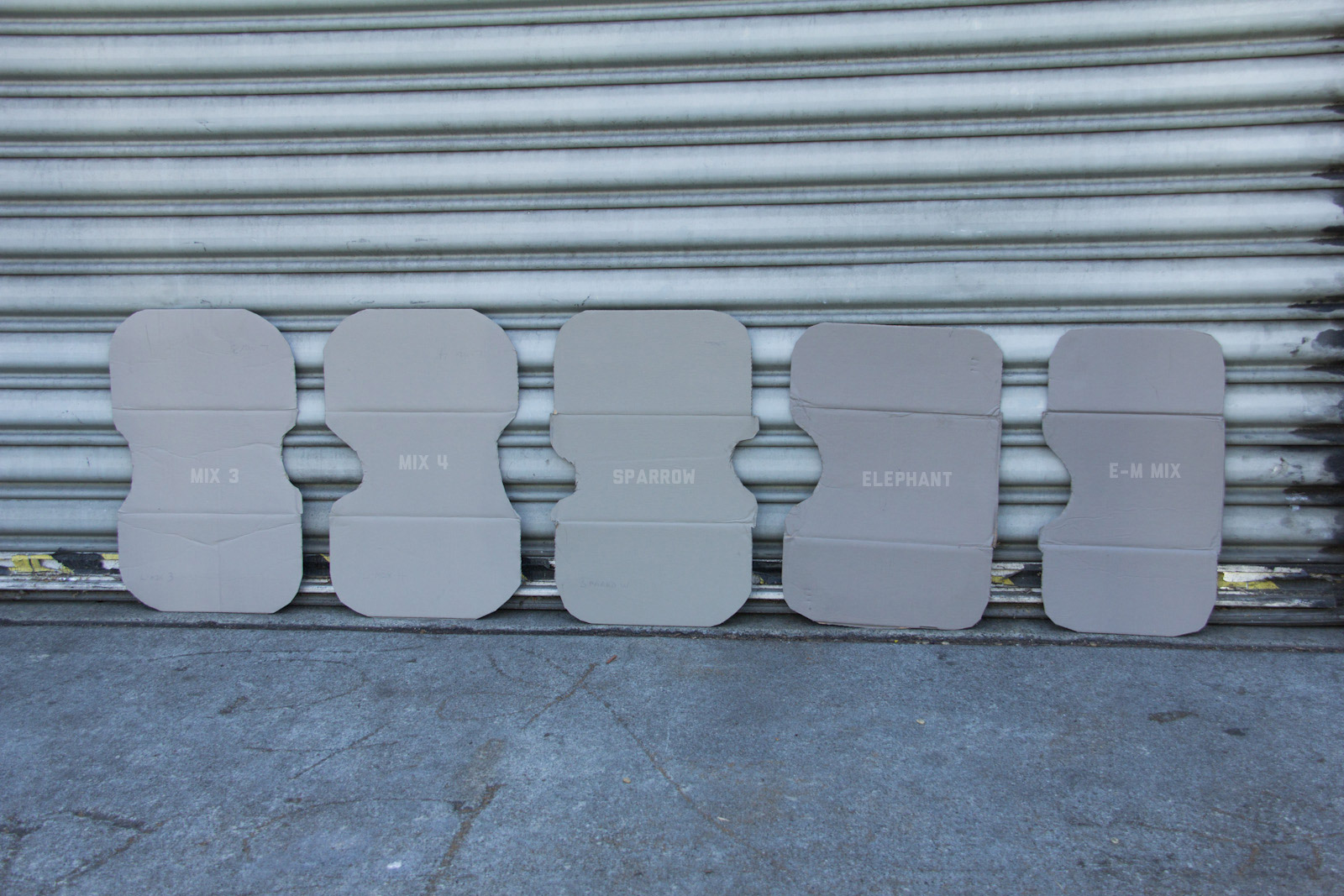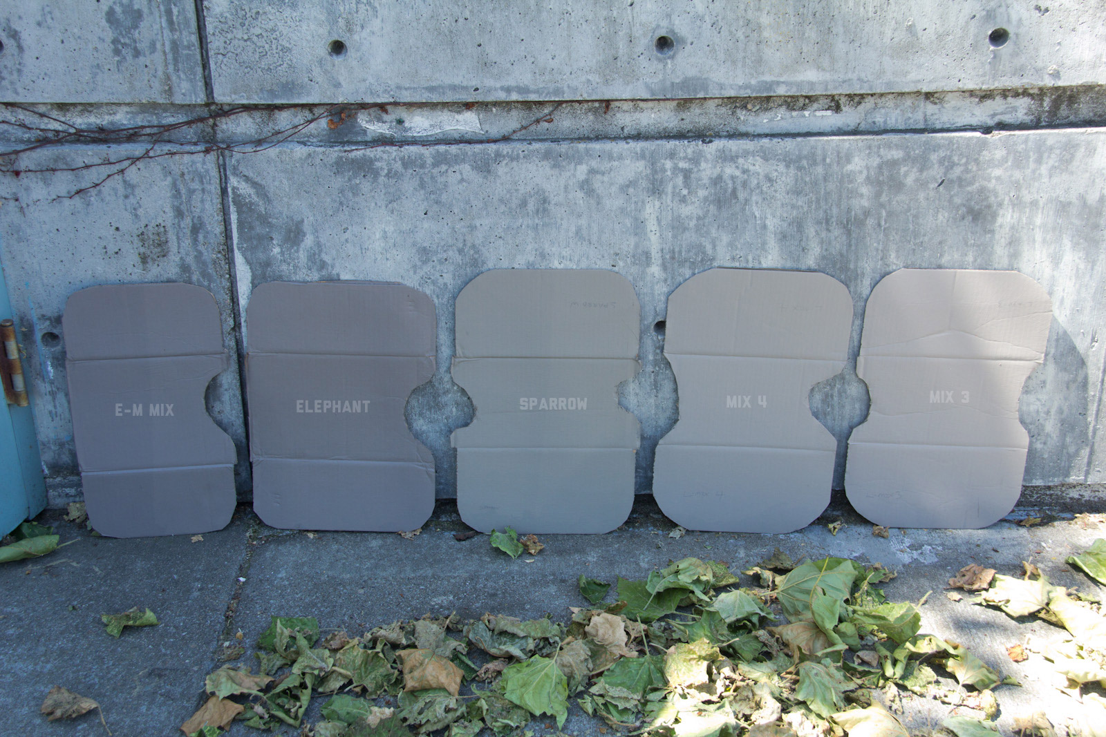 After some good feedback on this article I took the advice to try and investigate more concrete walls. As it turns out, most unpainted walls in my area are wicked bright, Pantone wise coming in around: 402 - 403, 7529 - 7530, WarmGrey 6 - WarmGrey 8, 7536 (on lighter end). I had my doubts hearing Crocodile (basically a desert tan) was being used in urban night ops, but after testing some lighter walls this made more sense. Based on this I got Wright Stone Tan 10YY 30/106 - card WN25 Glidden at Home Depot to add some lighter options to my testing. Instead of just small samples I also moved on to larger samples by painting cardboard chunks. For a more middle tone for my pile I also picked up Sparrow AF-720 by Benjamin Moore along with Brimfield RL4352 Ralph Lauren Paint, mostly as a light grey to mix with. By this time I dropped Mercer for looking too cool on most tests and in a bigger size the Fauna/Elephant had a little too much red, but was still good enough to keep around. Since Wright Stone Tan was going to be too rowdy on its own, I ended up with Mix4 for lighter end testing for a while. Despite enjoying sparrow for a light middle, it was showing just a little more green than wanted so after a couple more mixes I found Mix6 to be a nice result, being the middle of Elephant and Sparrow. I briefly tried Mocha, a color that looked good on the sample card, but with testing ended up pretty green.