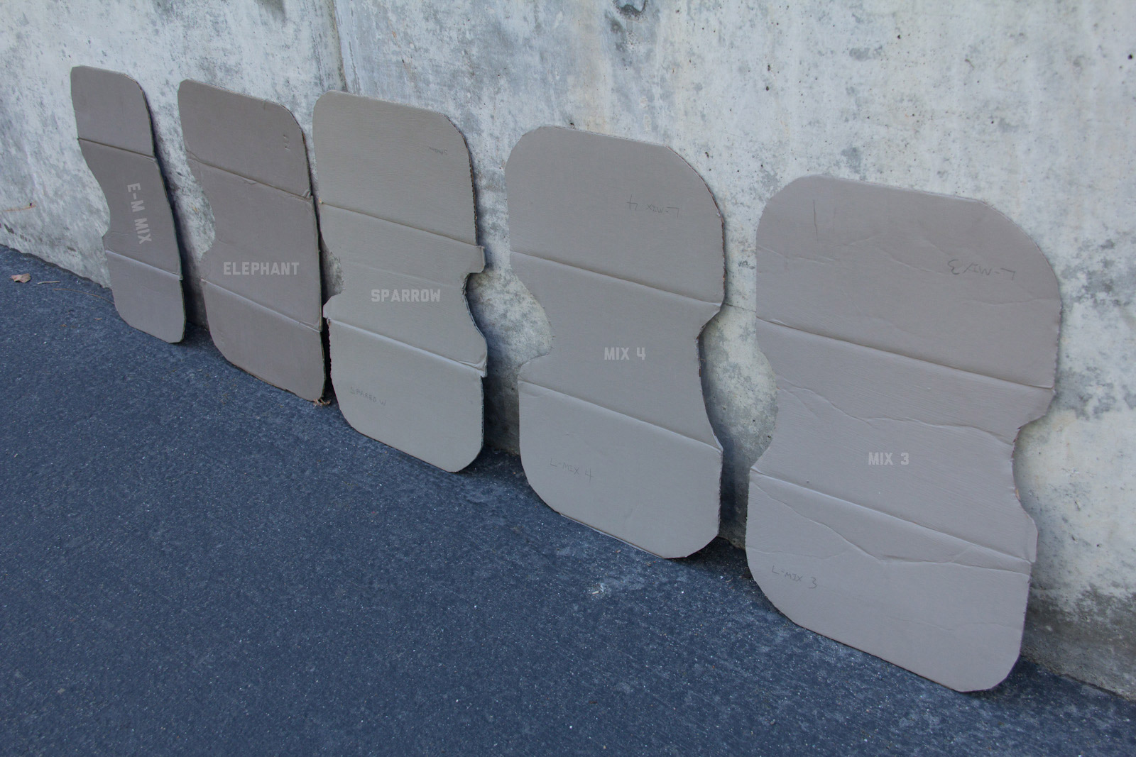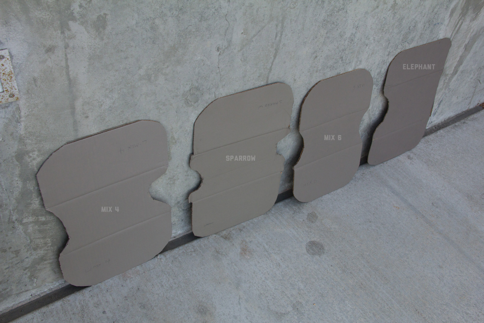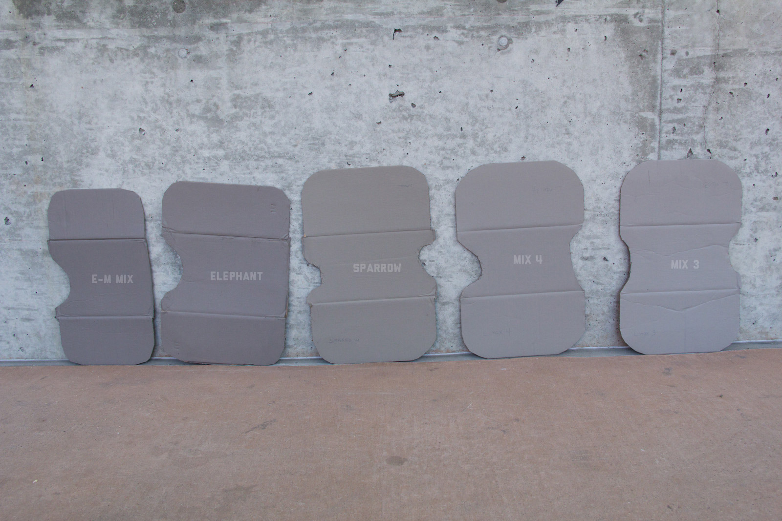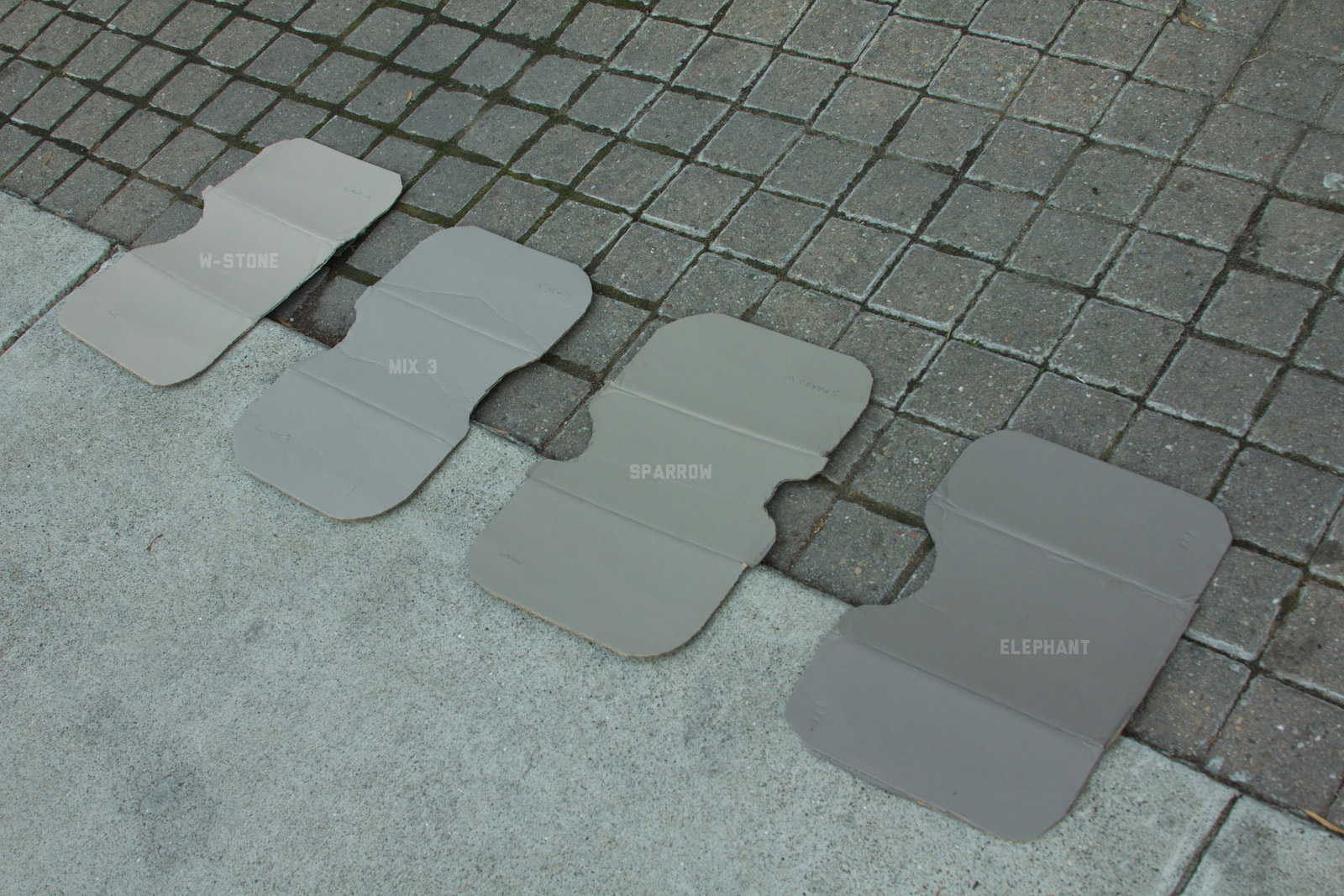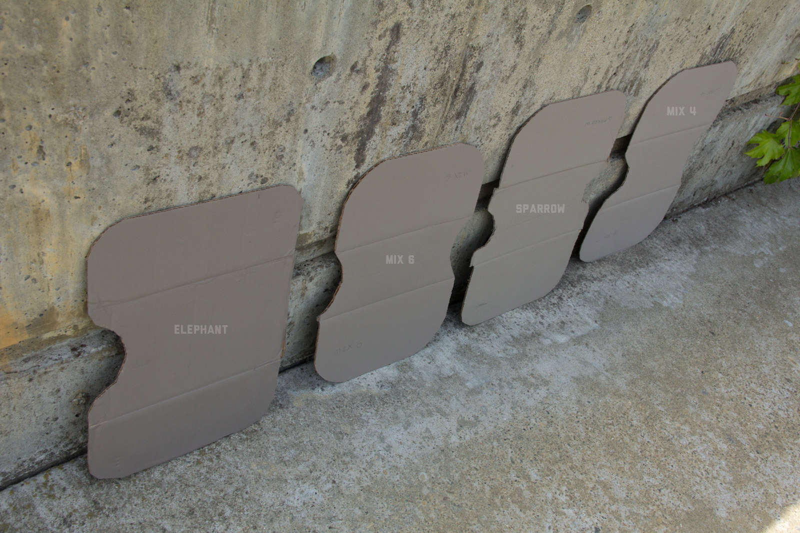 After some good feedback on this article I took the advice to try and investigate more concrete walls. As it turns out, most unpainted walls in my area are wicked bright, Pantone wise coming in around: 402 - 403, 7529 - 7530, WarmGrey 6 - WarmGrey 8, 7536 (on lighter end). I had my doubts hearing Crocodile (basically a desert tan) was being used in urban night ops, but after testing some lighter walls this made more sense. Based on this I got Wright Stone Tan 10YY 30/106 - card WN25 Glidden at Home Depot to add some lighter options to my testing. Instead of just small samples I also moved on to larger samples by painting cardboard chunks. For a more middle tone for my pile I also picked up Sparrow AF-720 by Benjamin Moore along with Brimfield RL4352 Ralph Lauren Paint, mostly as a light grey to mix with. By this time I dropped Mercer for looking too cool on most tests and in a bigger size the Fauna/Elephant had a little too much red, but was still good enough to keep around. Since Wright Stone Tan was going to be too rowdy on its own, I ended up with Mix4 for lighter end testing for a while. Despite enjoying sparrow for a light middle, it was showing just a little more green than wanted so after a couple more mixes I found Mix6 to be a nice result, being the middle of Elephant and Sparrow. I briefly tried Mocha, a color that looked good on the sample card, but with testing ended up pretty green.
