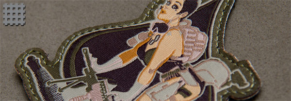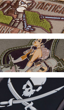 PVC is another type that is gaining a lot of popularity these days. As a historical note, we were one of the first places to make PVC morale patches popular, just sayin'. One of the reasons I like PVC and is popular with others is that it allows art to be very precise with interesting depth effect possibilities all while being quite durable. Since mold based there can be extra setup costs associated which generally makes small batches cost prohibitive. A noteworthy limitation on PVC is that gaps are required for color changes within a design so the art needs to be done with this in mind. This is why we haven't done many pinup designs as PVC since say on a highlight zone, the gap-zone will end up looking like a thin black outline greatly changing the overall look, and not for the better. A sometimes appropriate work around is to add a color on-top of another color rather than at the same depth level, this way the gap is not needed. Quality control wise usually the main PVC consideration is keeping an eye out for any sort of color bleeding. For a small consideration if sewing hook on the back a sewing trench will be needed in the design. It usually isn't a super big deal, it just ends up looking more obvious than say on an embroidery patch. Overall PVC offers great durability where it takes much more damage to cause marks and they will never get fuzzy borders or edges. Every factory is a little different, but generally color options are good and are semi consistent being based on Pantone colors. When a more specific match is needed we have sent physical color samples to the factory to help them color match things like military gear colors.
