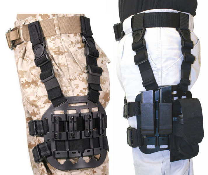 Moving weight off your back and shoulders helps spread out one's loadout weight and when secured properly, droplegs do not hinder most movement. Although one can get by putting a drop leg onto a typical belt, a duty belt with some stiffness is recommended. Otherwise the belt will get a bit bent up. The most common connection is a simple velcro wrap, sometimes with a flap with hook on 2 sides to stick to duty belts with velcro already on them. There are also different ways to mount your dropleg, but in my opinion, mounting on a battle belt is the way to go. Using extenders such as Emdom's drop leg hanger allow one to mount a drop leg to one's vest/carrier. This is a solid platform, however: weight is now mostly right back on your shoulders, leaning side to side movement is restricted, and if you take off your vest/carrier you also need to take off your dropleg(s). Another option if the dropleg is built for it, is a direct belt mounting behind the pannel with no velcro strap. This is the ultimate in a "high ride", but the user must bend the whole drop leg panel everytime their leg moves. This occurs since usually the vertical belt connection strap is the pivot point, but on a direct belt connection the pivot point is the belt and the back mount loops, which as you guessed don't pivot at all.