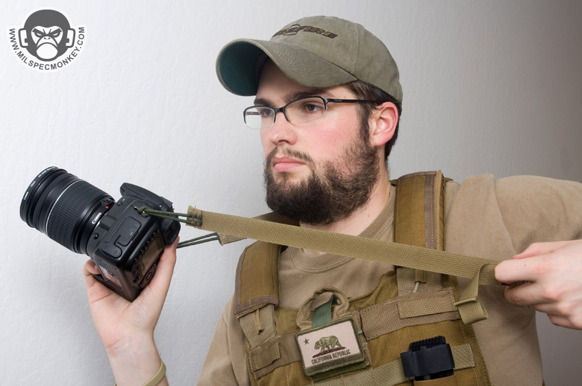 This is a simple and effective strap for your fancy camera or pair of biznocs. I'm a camera totn' dude, I mostly use it for that. To mount, the strap has 550 cord ends to go through the strap mounts. Since mounts are pretty slim on the cameras, I was thinking "good fucking luck!" at first, however was able to ram the cord on through with some poking effort. This is a security bonus since most straps have little ladders or triglides for mounting which can break or loosen.