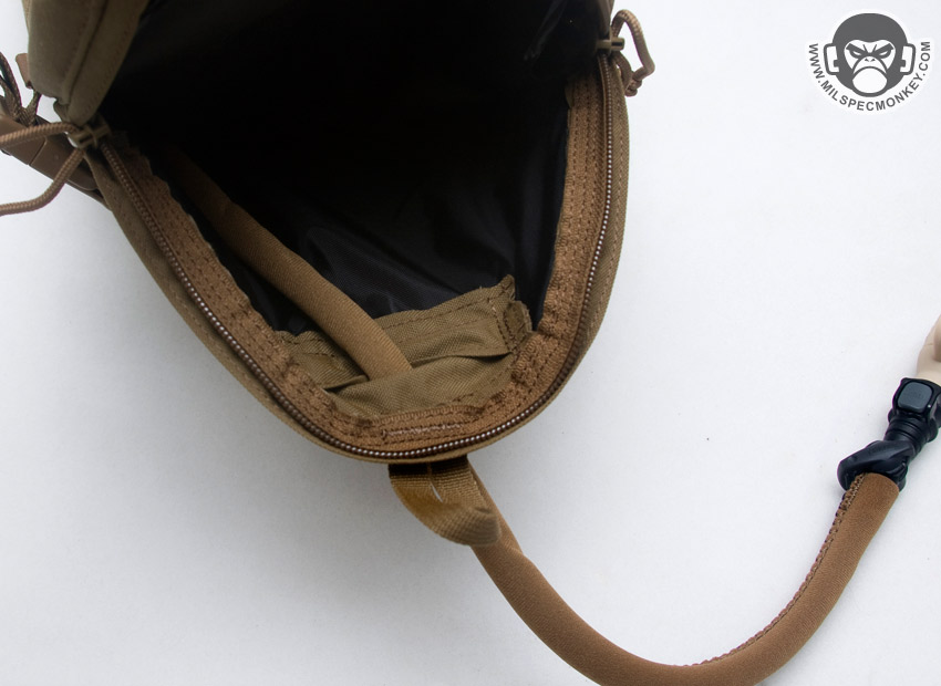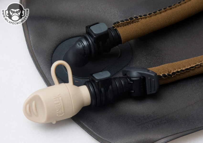 A 1" strip of loop velcro is on the exterior for name tape mounting and a webbing loop is up top for hanging. The Armorbak package includes the OMEGA Water Beast 102oz Reservoir which is fancy in of itself including the Big Bite valve and Hydrolink valve cover. I found the on/off switch easy to use preventing drips and it is a bonus to see most parts are modular to allow easy replacement if any parts get broken or funky. The carrier has a hose port in the upper back allowing left or right side use and a grommet is at the bottom just in case your adventures get you wet. Although not a deal breaker I found it odd there was no internal loop to hang the bladder on. If you want it bad enough you can force the external loop through the hose port, but it does not appear this was intended.