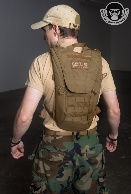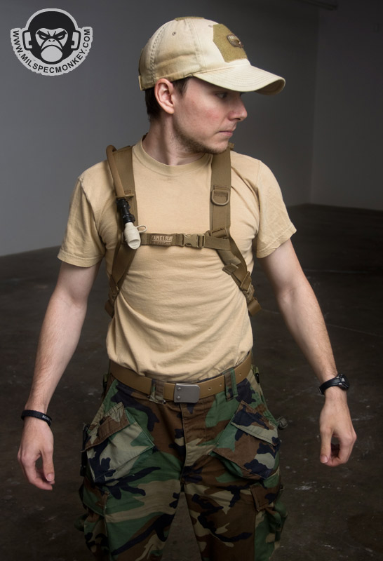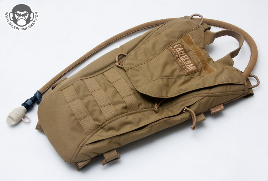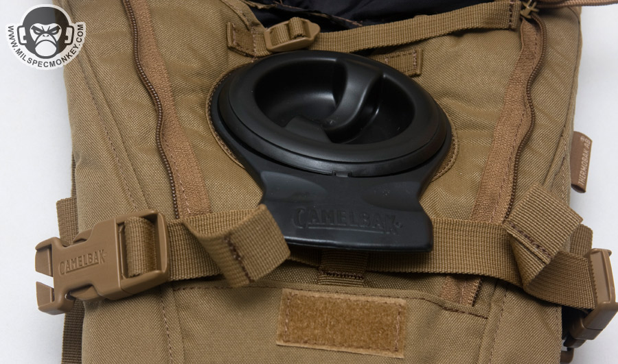 The OMEGA Water Beast 102oz Reservoir is included and fits in a crafty manner allowing the majority of the bladder to be covered, but the main opening is accessable under the flap. An adjustable webbing loop is even up top to secure the bladder on. The Big Bite valve and Hydrolink valve cover are fortunately included in the package. Most users will route the main tube through the upper left or right shoulder ports, however the lower sides of the carrier have additional port holes for more options. There is even a zipper down the side for quick internal access whether it be to adjust the bladder or toss in some scoobie snacks.