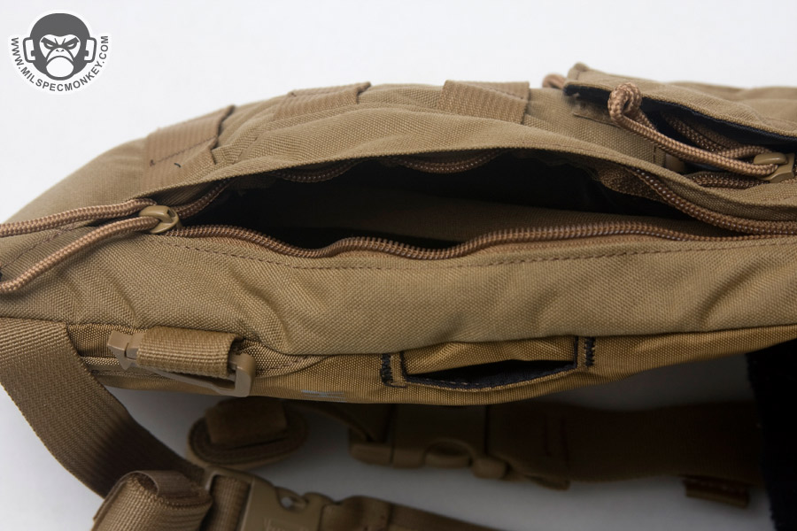 The shoulder straps are full-on including a sternum strap making it a solid ride when directly worn on a person. There is good attention to detail where D-rings and the slack management system is even integrated in the main webbing straps. When it is desired to be mounted on a vest, the backpack straps can be tucked into the back sleeve and the lower connection points also have pockets on the lower back to be stowed in. 4 Webbing loops with slick-clips on the sides offer easy attachment to PALS webbing along with 2 repair SRBs along the upper middle. Like on the Armorbak, the repair buckle strap allows cinching down to create pressure. Note these straps are hidden under the flap on my main exterior picture. This flap uses a zipper and velcro seal system giving a fairly smooth opening with coverage security. On the upper portion is a 1" strip of loop velcro for name tape mounting and a substantial webbing loop is up top for hanging or to use as a handle. On the lower front of the exterior is even some PALS webbing (3x3) to allow mounting of a small pouch or 2.