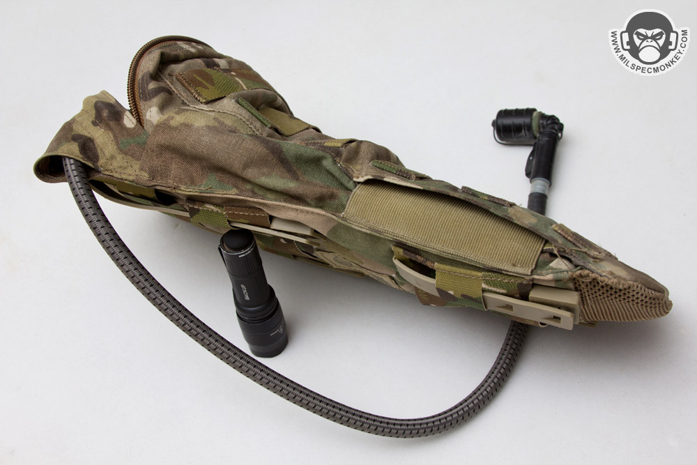 No strap wrastling is required, the pouch just works. Thus the end result is nice and low profile; a great option for assaulters. Mesh is used on the bottom area offering superior drainage for any water spills or water ops rather than just a small grommet. Up top a single zipper is used for the opening. The size isn't large, but adequate, likely for a good balance of durability. If the zipper were to somehow blow out, the rest of the pouch should hold up fine and retain the bladder. Simple ports are on the upper sides to allow ambidextrous hydration tube routing. They are nice and simple with no velcro, yet angled in such a way to keep out most debris. On the back PALS webbing is laid out to accommodate 2 large and 2 short Malice clips (included) as the main mounting method. Of course users can use the webbing to get creative with other attachment options such as Grimlocs. The Source bladder is not included to let users pick whatever bladder they want to use, however SKD offers the WXP 2L amongst other solid options so you can buy both at once to keep shipping costs minimal. Seemingly simple at first glance, all the little good design details sum up to create a great all business design. Made in the USA.