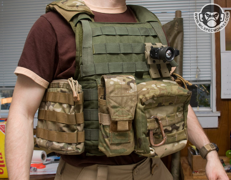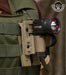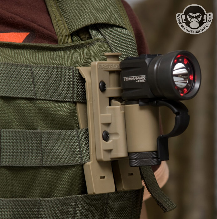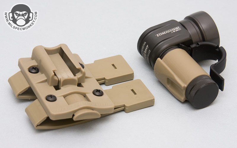 The default metal clip is grand and all, but First Light went a step further to make a custom TRS (Tactical Retention System) mount. The main connection system uses 2 short MALICE clips or MOLLE-LOKs which are screwed onto the the base. These can be detached and rotated to allow the Tomahawk to be mounted in a vertical or horizontal position. When mounted verticaly the light can be rotated left and right and when mounted horizontaly it can be rotated up and down. I mostly see myself desiring up and down rotation capability, however it is all up the user and their needs. To interface with the base the metal clip and grip tube is removed and replaced with a hard tube that has an extrusion to snap into the base. To mount, the Tomahawk easily slides into the TRS base while a thumb button exists for a hassle free release. As a nit-picky note, the connection is a little loose allowing some wobble. This issue is minor though, and overall the TRS is more secure than the metal clip since a button is required to release.