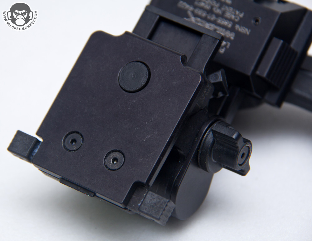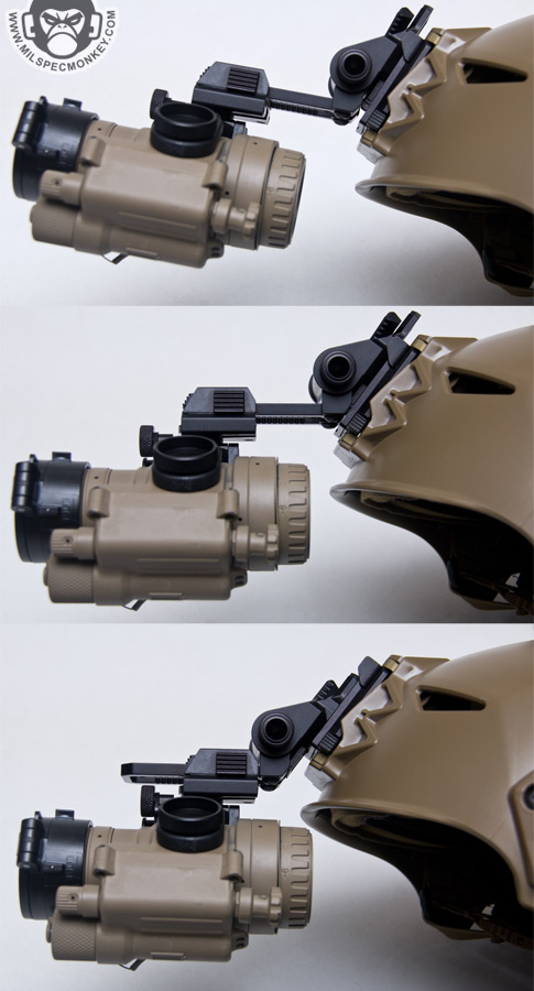 I like how there is a split between the NVG attachment arm and the rest of the mount which offers more NVG storage options on one's self. The NVG plus mount makes a bit of awkward shape when it comes to pouch storage while detaching at the the shoe mount is still a quick way to take on and off while leaving most the mount on the helmet. Somewhat on that subject, the main connection button of the mount to shroud isn't very complicated, however does take some getting used to to put the mount back on while wearing. This is mostly due to the not being able to see it factor, however releasing is much easier. Another cool function is that the main shroud connection can be set to a hard connection or a break-away setting. This setting basically just adjusts how far the main lock bar goes into the shroud and when in the breakaway setting it is enough to be a solid fit yet will allow breaking away with heavy force. This way one can have a full lock when just hard using on the ground, yet have the option for break away when doing high speed stuff like fast roping where it would be better to lose snagged NVGs than to break one's neck.