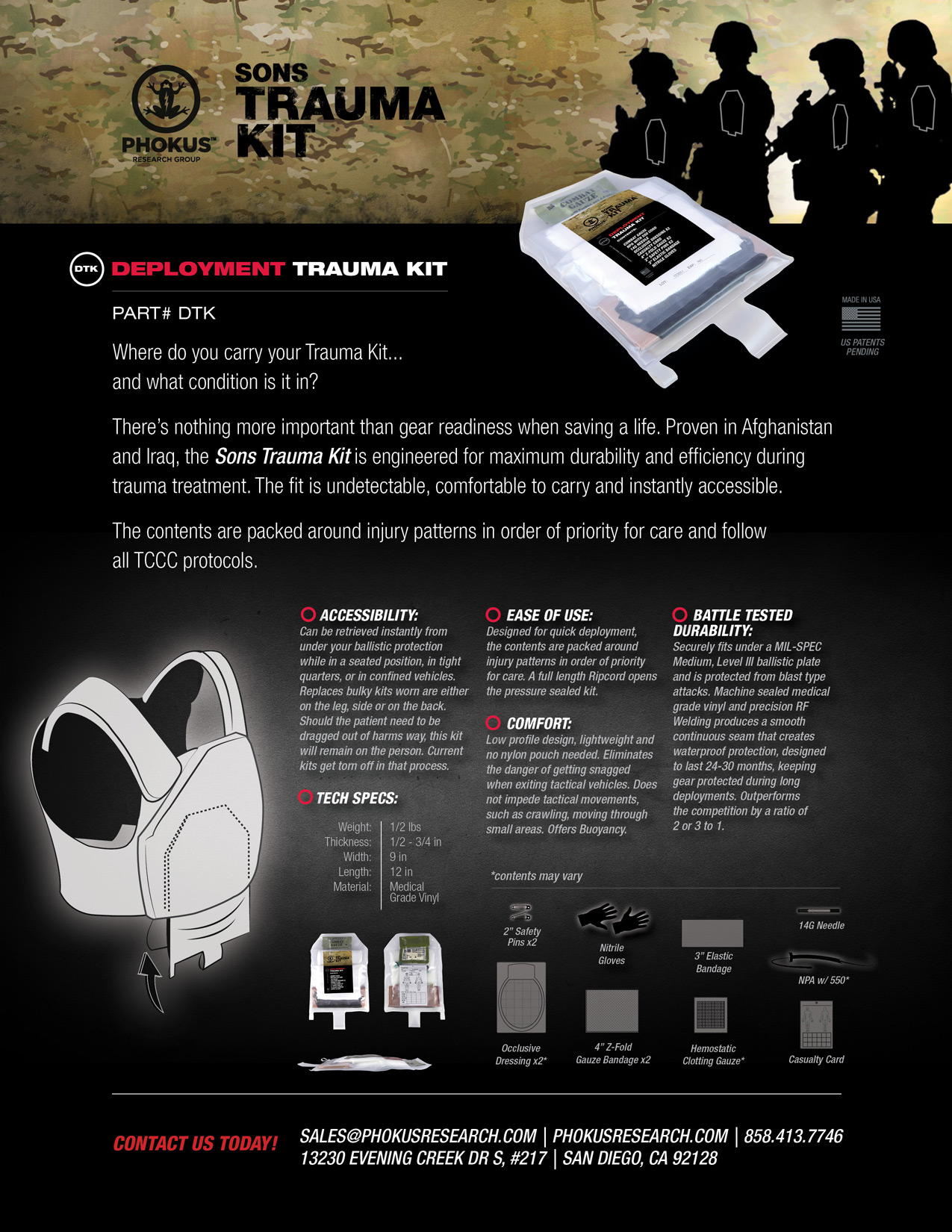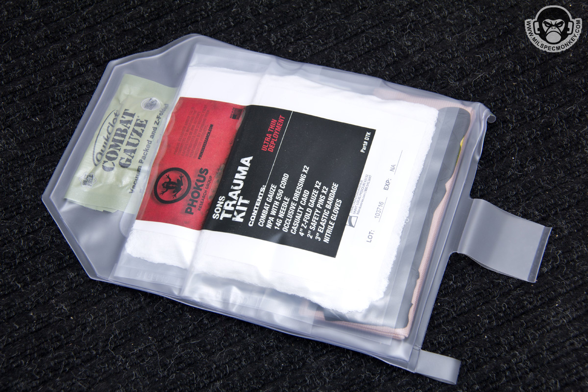 Phokus Research Group has been up to some crafty products for a while, one being their Sons Trauma Kit which offers an interesting alternative to traditional medical blow out kits. Rather than being a kit with a fancy pouch, the kit is shaped flat and slim sitting behind one's armor plate to make a great use of tactical space savings.