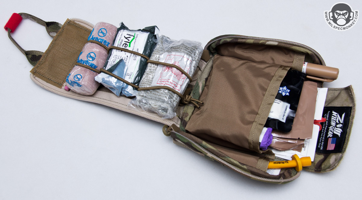 This Fatboy version measures approx 7″ Tall x 5.25″ Wide x 2.5″ Deep which is about the typical size for an IFAK (Individual First Aid Kit), however the rest of the design is fairly non-typical. The main opening is optimized for quick access utilizing a good sized webbing pull handle and dual zippers offering a tear open functionality. Being more of a half ellipse shape instead of a classic rectangle adds noticeable smoothness opening. A little bit of hook and loop closure up top makes sure the zipper doesn't slowly open accidentally with normal use. If worn in a fairly accessible place like up front on a chest rig, then all goods are easily accessed by both hands. Malice clips are provided by default, but for those who still need a full pouch tear off option, ITS also offers Molly Stix which provide a disconnect by pulling their connection cords away from one's body. That could be a whole other review, but check out the video on ITS's site for now :)