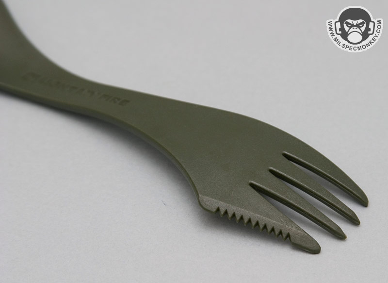 Got a couple of these for amusement around the house and on the move eating. One side is all spoon, and the other side is mostly fork with a serrated knife edge flair. Made from heat resistant Poly Carbonate material, the spork is durable and flexible. It will stay rigid for most uses, but say on ice cream, it will flex a little bit to get the job done. Heat transfer is slow so it is great for hot / boiling liquids. They are dishwasher safe and since not hard metal, are safe to use on fancy cookware with Teflon. The shape isn't good for holding savage "I'm starving" fist style, but works great for the more table manners oriented grip. Advantages of this design is that you get the full effects of utencils. Compared to other sporks, the spoon side is deeper thus can hold more and the fork side has full size prongs to allow poking of thicker foods. The knife part isn't full size, but there is enough serrated area to get your cut on. This 3 in 1 action takes up less space and weight then having 3 separate utencils while still keeping usability. The Super Spork is also very affordable so no drama if you lose one. Multiple military and hi-viz colors are offered, but availability comes and goes.