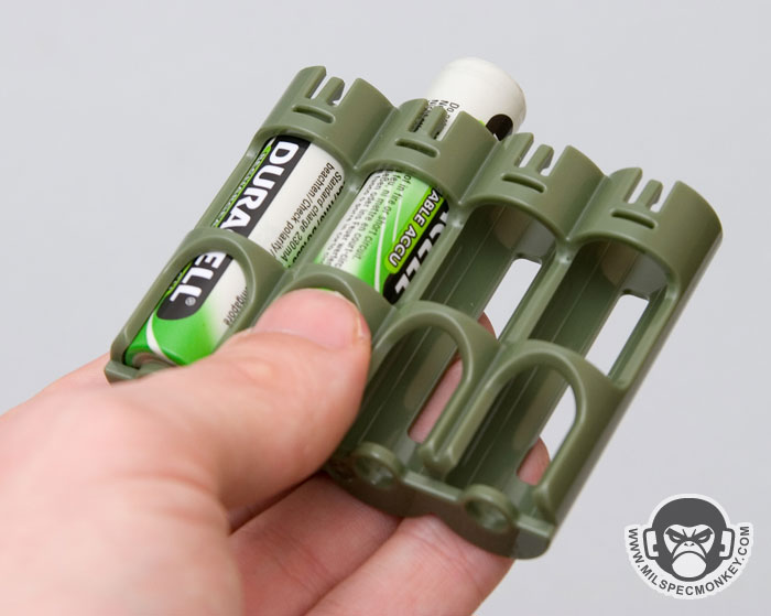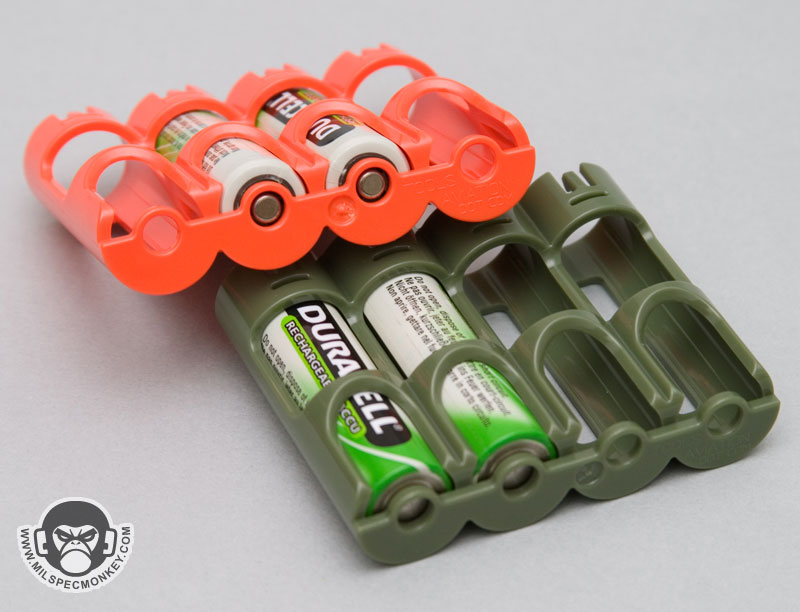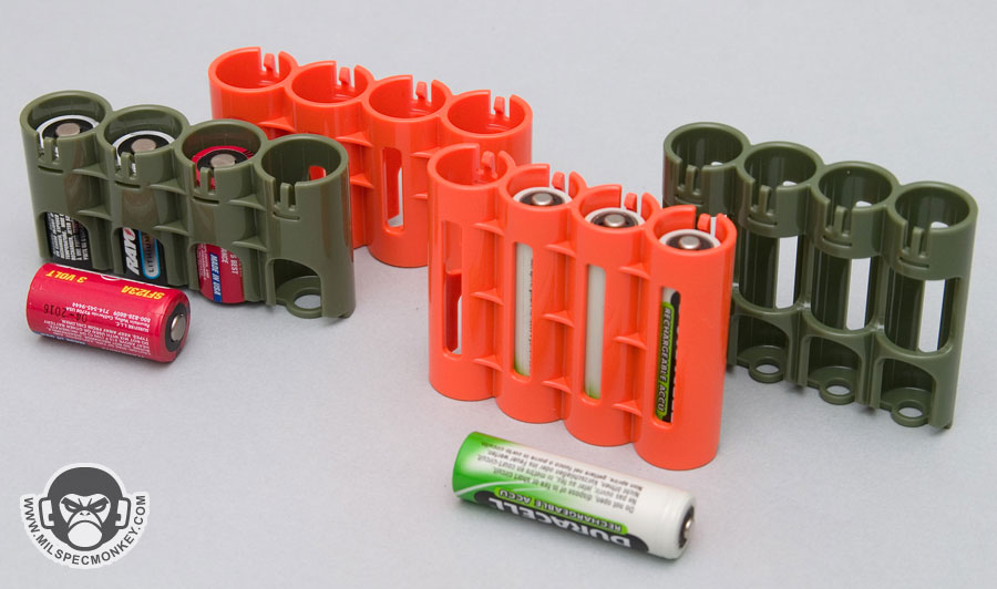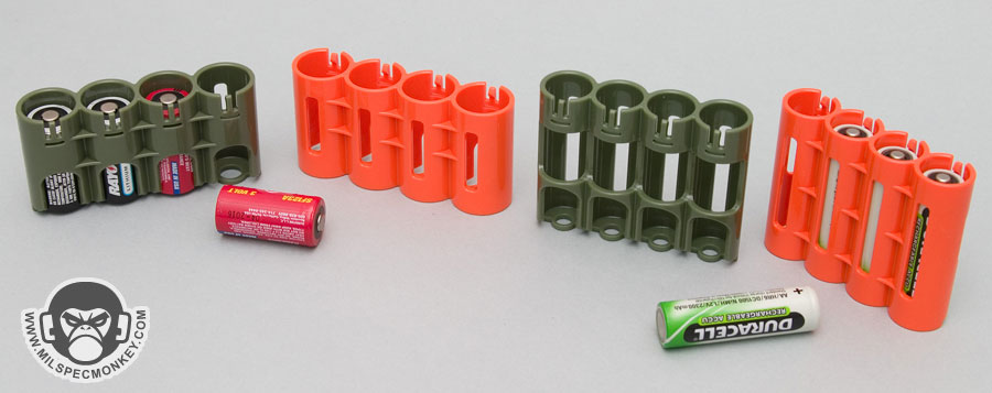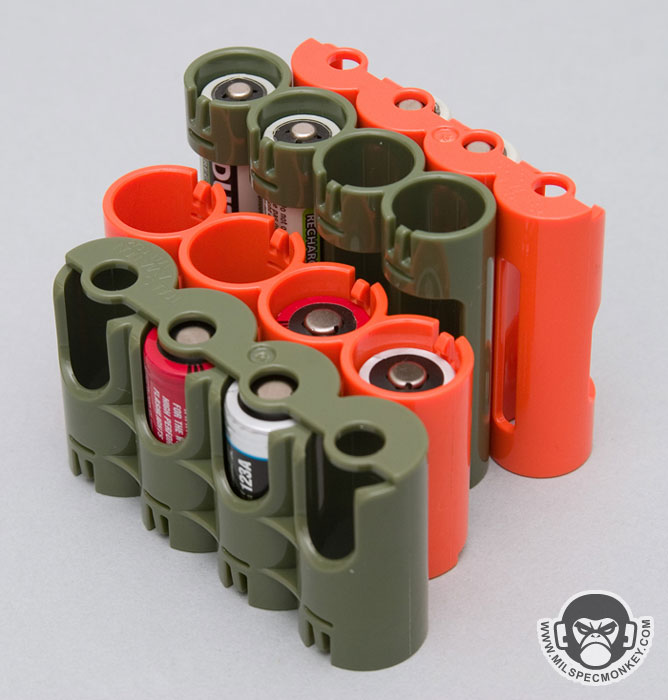 Got some of these recently and although simple, I find them pretty handy and well designed. At first I blew off the thought of battery holders for a while thinking I'd just toss them in small pockets on my bags or kit. I wasn't too worried about my batteries shorting, but then I saw the selling point of no more digging in the bottom of your pack for that last battery; I've so been there so decided to give them a try. Made of tough nylon plastic, the holders are available in both AA and CR-123 versions, holding 4 batteries each. 2 Colors are offered for each type including International orange or OD green. The orange is great for the hi-viz factor and the green is nice and tacti-cool looking. Usability is great. Batteries easily slide in and it doesn't matter which way you insert the batteries. The end tabs will keep the batteries secure through a shake fest, but still allow easy deliberate extraction of the batteries. One side has cut-outs which lend a hand allowing the user to push the batteries out instinctively with one's thumb. Only downside was the height tolerance is enough so the batteries can move up and down in their tubes and cause noise. This however, is more of shake them in your hand factor and less when actually inside a pouch.