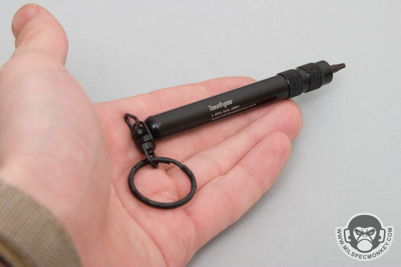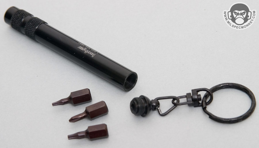 Since I don't have a big Torx screw set this guys comes in handy to adjust the clips on my knives. Very compact and lightweight, it comes with the most common screw heads to adjust your knife clips. To use, just unscrew the ring end and pour out the bits. Place the desired bit in the other end, which will be magnetically held, and get down to business. The bit sizes specifically include: A Torx T6, T8, and a Philips head driver. Overall length is about 4" and the handle is made of aluminum with a slick teflon coating.
