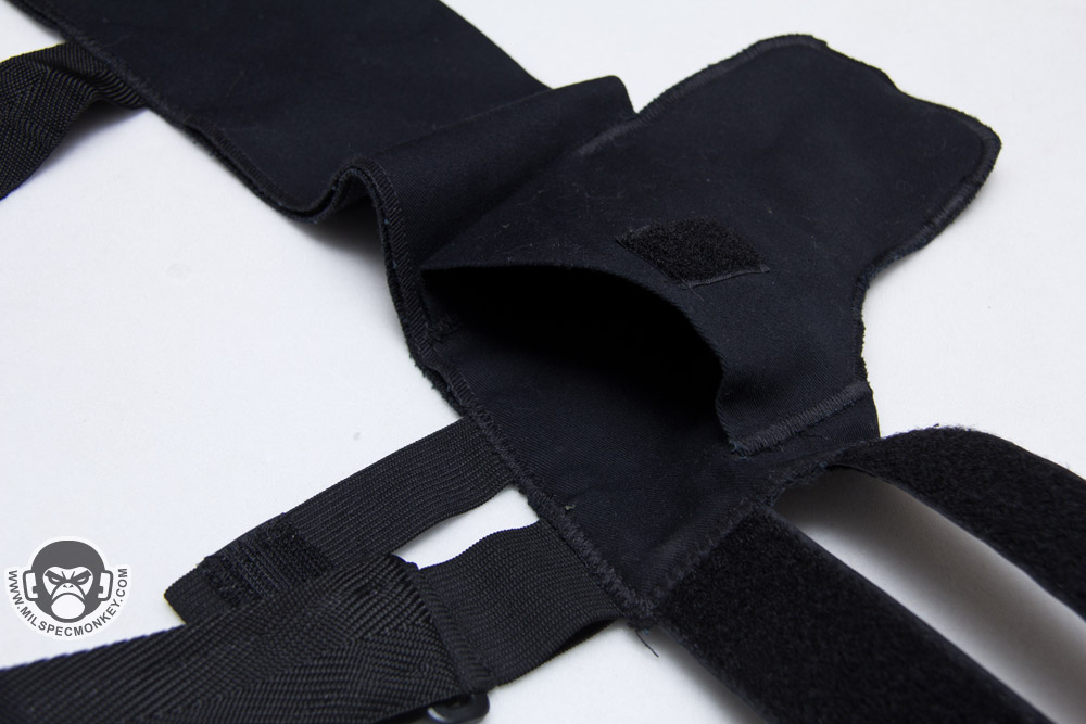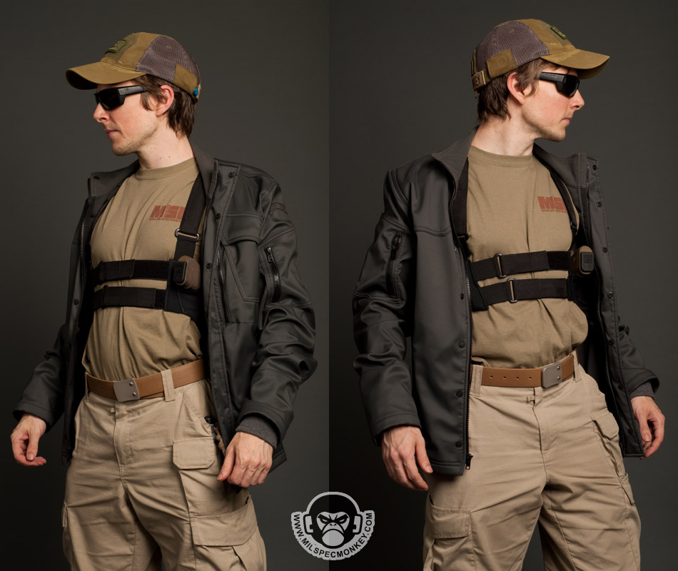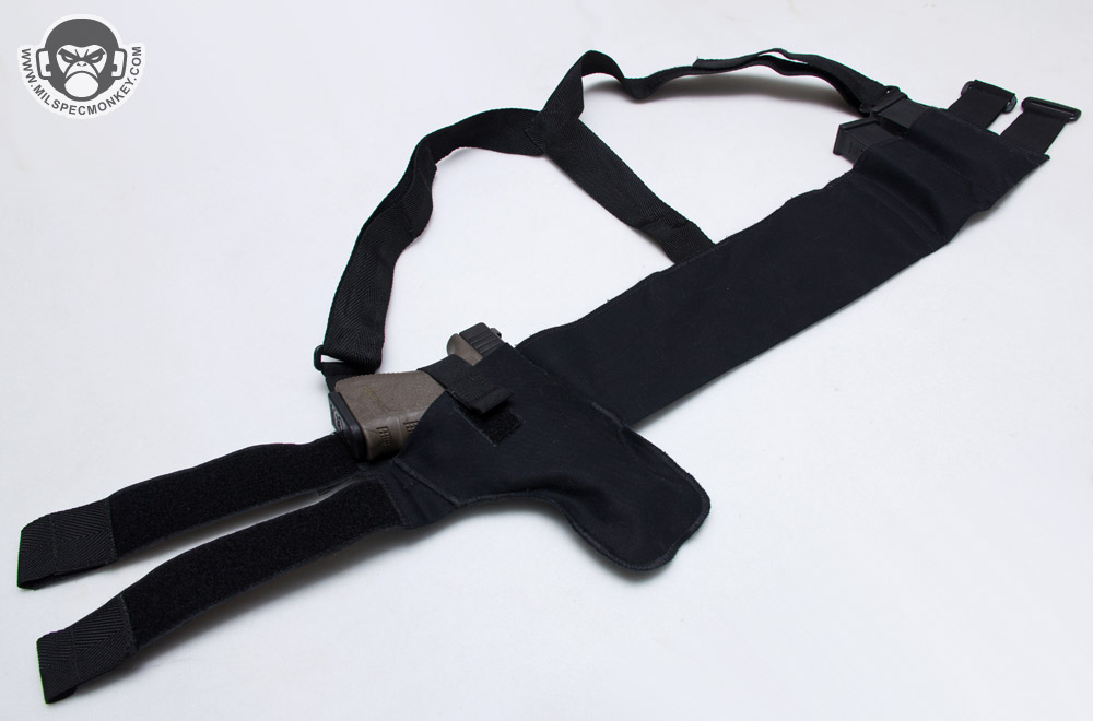 Construction is fairly straightforward using basic materials of fabric, webbing, velcro, and elastic. For the price I think some nicer materials could be used, but as is it functions and the basic construction keeps the depth low profile. Sizes are offered from XS all the way up to 5XL. I am still a wee-man so sport a Small. Like most armor, black and white colors are offered to match most attire needs. Wearing and adjustment functionality comes from 2 shoulder straps and 2 torso straps each with a good amount of adjustability via velcro. Due to connection locations it is even easy to adjust while wearing. The torso straps also feature some elastic which is very important for comfort to allow a good tight fit while still being able to breathe. Plastic hardware is used which is a little bulky, but I have not been pinched by them yet. Metal hardware would be an even more low profile option at minimal extra cost. Having 2 torso straps rather than one big one adds to comfort adjustability. All of the adjustable straps in general are important as the placement of the ultra holster greatly changes functionality. Up high and tight is good for concealment while letting it hang lower or even offset from body center makes it more accessible. With some sort of clothing for concealment the main concern is definitely length of grip so keep this in mind on deciding which pistol to use along with magazine types. For my testing I used a Glock 19 with standard magazines and that is about as big as I would recommend for good concealment. You can certainly go bigger and get high cap magazines, however the printing will start to be noticeable.