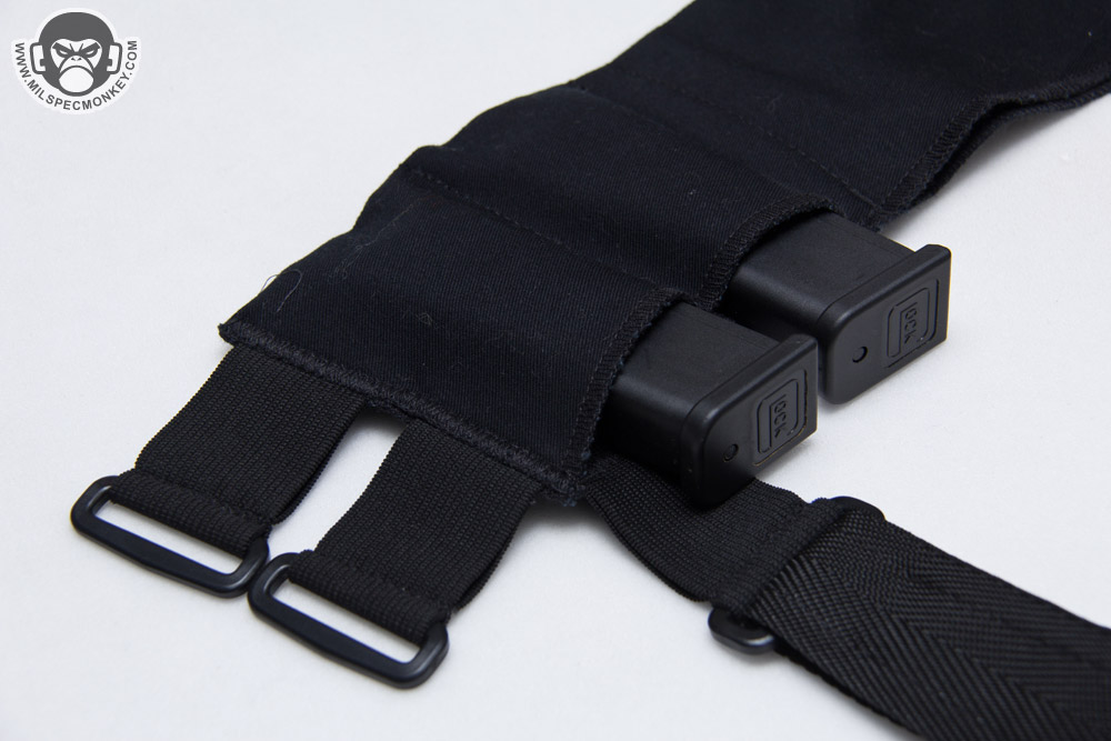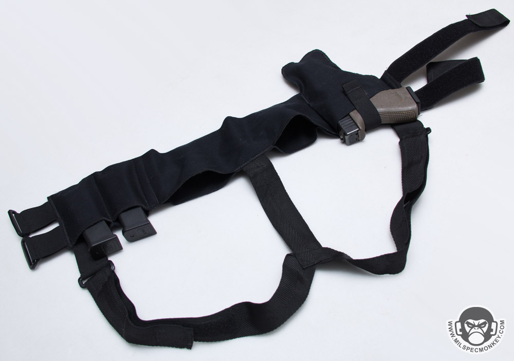 When it comes time to whip the ol' blaster out, I have a bit of trouble getting a good combat grip and usually have to correct it before punching out. Also during an attempted speed draw I find my thumb getting jammed up in the shoulder strap sometimes. Although it comes with a little securing strap, most users probably will not need it and it gets in the way. Hell it even commonly closes itself after a draw, making re-holstering that much more complicated, but fret little as it can be easily removed with a pair of scissors. The magazines fortunately aren't too difficult to access. Now although height ride adjustment helps accessibility, it would be nice if there was extra adjustment on the back which would then alter how centerline the holster and pouches are; Placement further from the center being good for concealing, and closer to the center being better for accessibility.