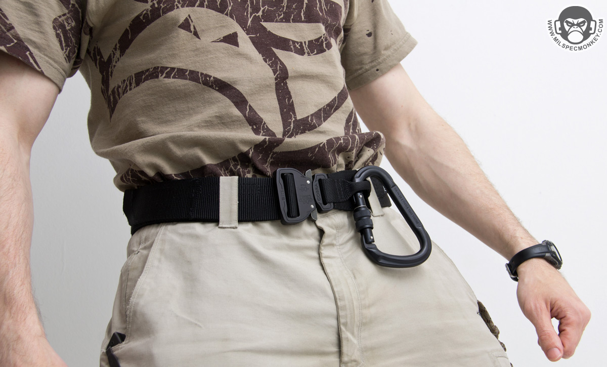 For starters the big show is definitely the Cobra buckle, which is a bad ass buckle; looks slick, quick/easy to use, and climbing rated. One down side however is most folks want about 1.75" of width for a rigger / gun belt and the corresponding 1.75" Cobra buckle typically doesn't go through pant loops so great. As a result one has to break down the belt each time they want to take the belt off a pair of pants (Hey we all gotta wash our pants eventually). It isn't the end of the world, but a hassle compared to say traditional belts. To fix this problem the Maverick has the main webbing still be 1.75" wide with a female adjuster Cobra side, while on the other side the belt tapers at the very end to a 1" male making great use of the Cobra interchangeable parts. This 1" male is much more manageable to push through belt loops while still having the heavy duty durability.