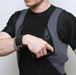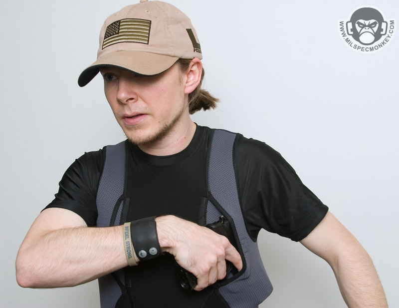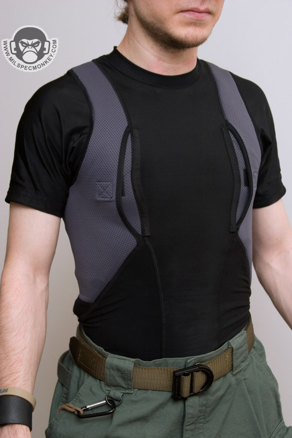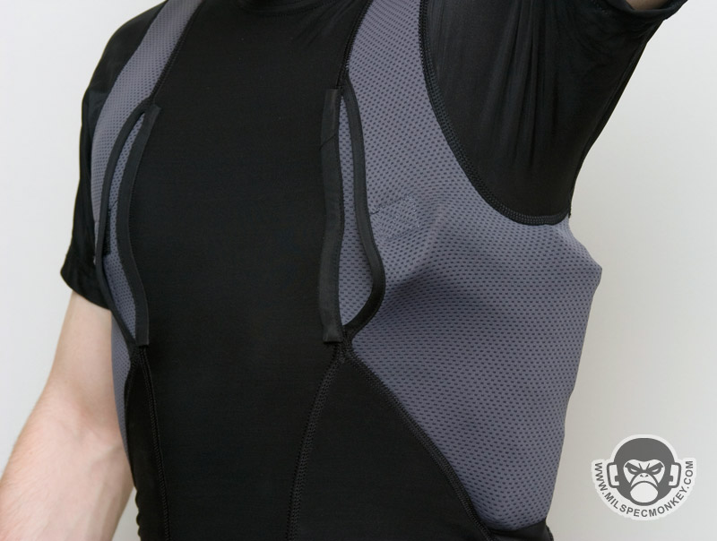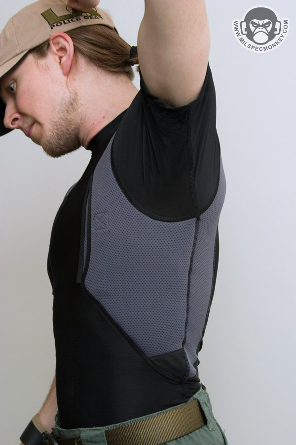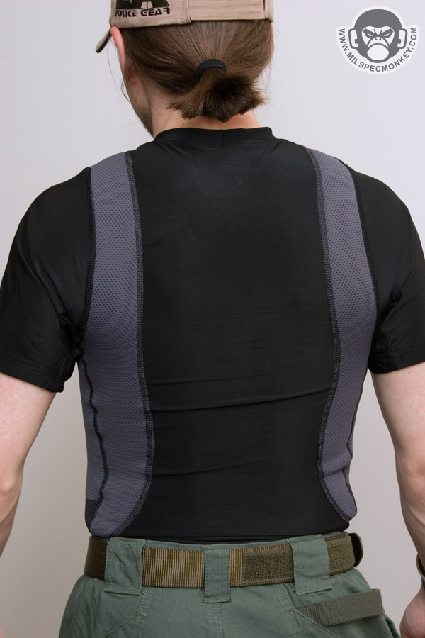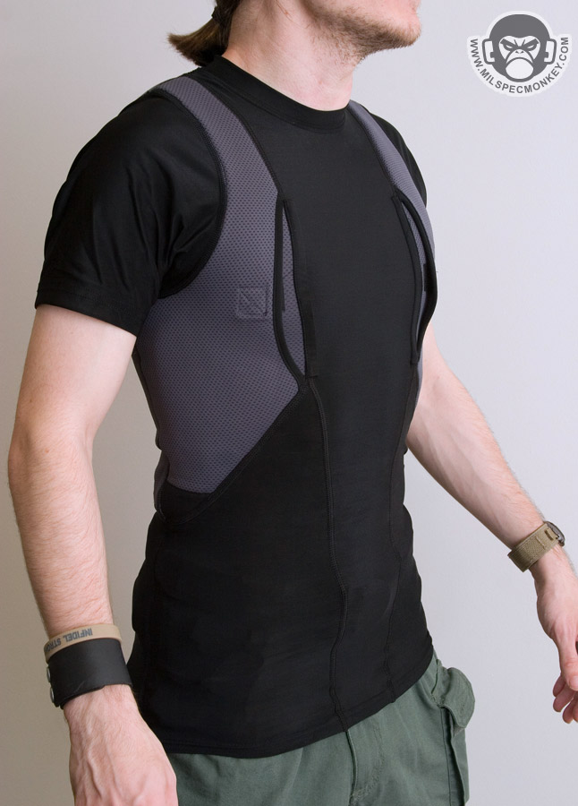 It is not meant to be a speed draw system, but if you want to get to your weapon as quickly as possible, you will need to make sure and have buttons open on any outer layer clothing. When going super low profile the outter layer of clothing is important since the holster shirt gives a less than casual wet suit / compression shirt look. If not covered, people will be able to see the shine of the shirt and think you are going clubbing soon, or up to something when you'd rather be blending in. The length of the shirt is nice and long so you won't have any trouble tucking it into any pants and still have the option to pull it up some to make the fit more loose. From wearing around, I noticed a slight draw back is that the shirt gets a little itchy on the lower sides where a good deal of stitching occurs. Back to plusses, the shirt can be used for any other items you can fit in the pockets: phones, mp3 players, handcuffs, and more. The 80% polyester/20% spandex fabric sports moisture-wicking, antibacterial and quick-drying qualities. Currently this shirt is available in white or black and also in V-neck.