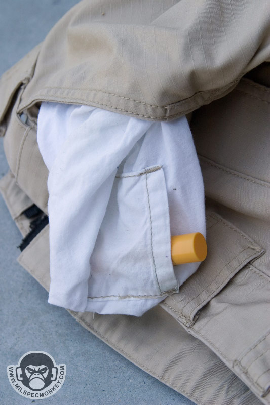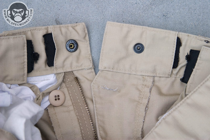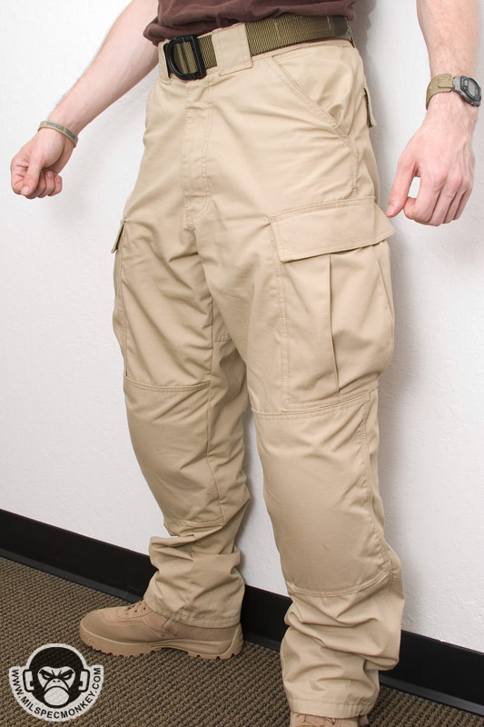 After this I was able to quickly go back to appreciating. I soon did some what would have been stain disasters, but the teflon treating gives the pants a bonus water and stain repellant quality. I like the cargo pocket design a lot. They are roomy and have been sewn with a divider to hold 2, 30 round mags. These spaces are also great for flashlights, multitools, and more. Loop velcro is in there as well to work with 5.11's Back-Up-Belt System to allow attachment of gear specific pouches / holsters. The flaps are velcro closure which are a decent compromise of ease and security. Another great feature is that knee pads come STANDARD. They are neoprene and are inserted through a slot inside the pant to keep things looking clean and simple on the outside. I recently found out the knee pad areas will accept ballistic inserts as well. The fly is a zipper with a metal snap top and backup classic button. The main side upper pockets are roomy and the right one even has a mini sleeve inside to help hold smaller items. The back pockets have velcro closure like the cargo pockets and I find them to work well. They retain the basics like loose change well but are still easy to open. The belt loops are nice a beefy so you don't have to worry about them wearing down. The leg openings have basic pull strings available if you need to close things up to keep out debris. As for suggestions, I'd like to see a D-ring or connection point somewhere since the belt loops are so thick. The two frontal belt loops seem a little close together, but there is probably a reason for that. Maybe it is just me, but I'd like to see two more exterior frontal upper pockets like on my Specwargear pants. With most areas triple stitched, these pants are in it for the long haul. I highly recommend these and at $45 standard price, these are quite a deal considering the quality and included knee pads.