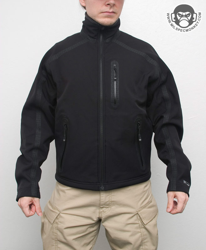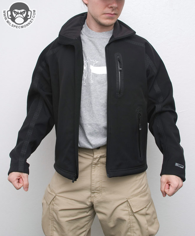 The meat of the jacket system is layer 2, The Ops Jacket. The sizing and thickness is what most expect out of a medium jacket, but it has additional element protection and features. I'm not sure what the main shell material is, but Blackhawk calls it a Durable water-resistant (DWR) soft-shell. All of the outer seams have been sealed by being covered with textured non-slip material and a large batch has been added to the elbows for added durability. The interior is made up of a combination of fleece/tricot and soft mesh to give warmth yet ventilation as well to the right places. The main zipper is that sweet semi auto locking kind as seen on the training jacket. I wonder about how long it will keep its spring/lock ability, but worst case it just becomes a regular floppy zipper. The other external pockets all have waterproof sealed zippers which have little metal tabs and pull cords including custom textured warrior wear tabs. The indented tear-drop shape of the pull tab makes a nice intuitive grip. Symmetrical pockets include 2 side hand pockets, 2 lower internal pockets, and 2 zippers open in the back exterior for access to the same pocket to create a "tailbone" pocket. Inside the hand pockets are convenient shock cord pull tabs so the waist can be be easily cinched. This can later be adjusted with the tiny cordlocks that control the shock cord located at the lower front interior of the jacket. The waist cinch system is separated by grommet holes keeping the pull tabs and cord-locks in place so you don't have to worry about their placement shifting. For asymmetrical pockets there is one on the upper front left externally and slightly lower internally. Just for clarification the would be the left hand side of the user. I can only guess these pockets are only on the left side to be setup for right hand dominant use and leave the right side area more clear for firearms. Either way, I wish the pockets were on the right side as well. I don't think they would get in the way and would give more organization while delivering ambidextrous functionality. A good sized loop is under the tag for hanging of the jacket. Overall feels nice, great performance for its weight and thickness while looking sharp at the same time.