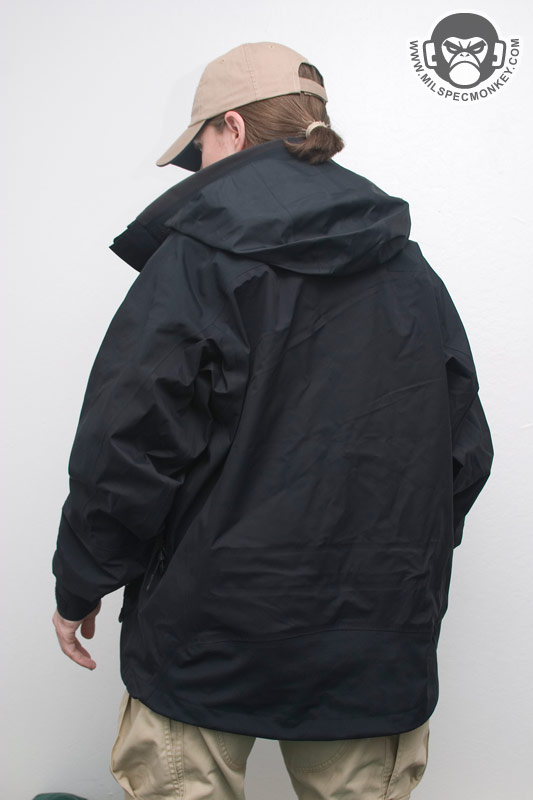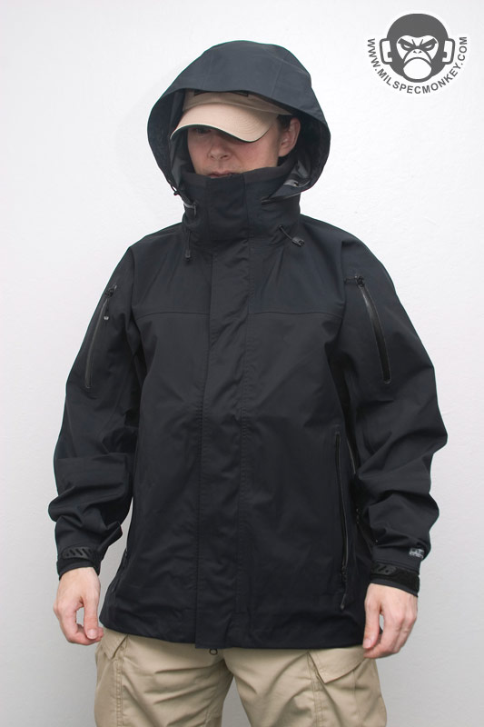 When you know the weather is going to be the suck, this is when you want layer 3. The Element Shell is water and wind proof based on a breathable 3-layer laminate hard-shell. All seams have been sealed internally to insure the water-proof performance. External pockets include 2 large side hand pockets and 2 shoulder pockets. Each pocket has water-proof zipper seals and use the nice custom zipper pulls as seen on the ops jacket. The same zipper setups, except with double sliders, are used on the sides for long pit-zips to allow easy ventilation control. Only the upper slider comes with a zipper pull so if one finds themselves preferring to unzip in a up to down motion, the pull can be removed and installed onto the lower slider. The main opening of the jacket uses a dual-direction zipper which is then made weather-proof with a flap that stays in place with velcro. Many areas include shock-cord and cordlock setups which are at the waist/tailbone area, the frontal bottom, and in the hood on both the opening compression and horizontal "headband" compression. The headband and tailbone cordlocks are a little harder to get to since located on the exterior and interior back sides respectively, but their existence is appreciated for adjustability. Another cool thing about the hood is that the upper back of the jacket has a built in pocket where the hood can be stored when not in use. This is much nicer than having a hood flop around when you don't really need it. As you may have guessed, deployment of the hood from the pocket is easier than stowing which requires taking the jacket off to do effectively. The collar area interior has a nice patch of fleece for comfort making this be the only area one might need to worry about getting wet. Even if a full interior drenching somehow occurs, the fleece is thin enough to dry reasonably fast. The cuffs are adjustable using loop velcro and rubbery straps with velcro compatible hooks built in. The velco dot is good for holding the straps when full hand opening is desired and the longer velcro strips allow the cuffs to be tightened on up. I like the rubber straps since they appear durable and conform to the arm curve. Since there isn't additional padding, the Layer 3 Element shell isn't made for the harsh cold, however it makes a great shell ready for adventures including hurricanes. Don't forget, what Layer 3 lacks in warmth can easily be solved with layers 1 and 2. When combined you got yourself a mean cold and water fighting jacket package.