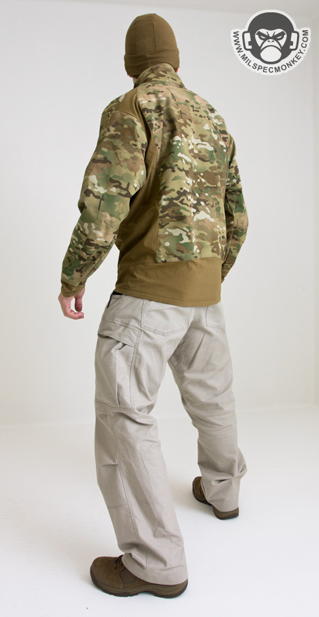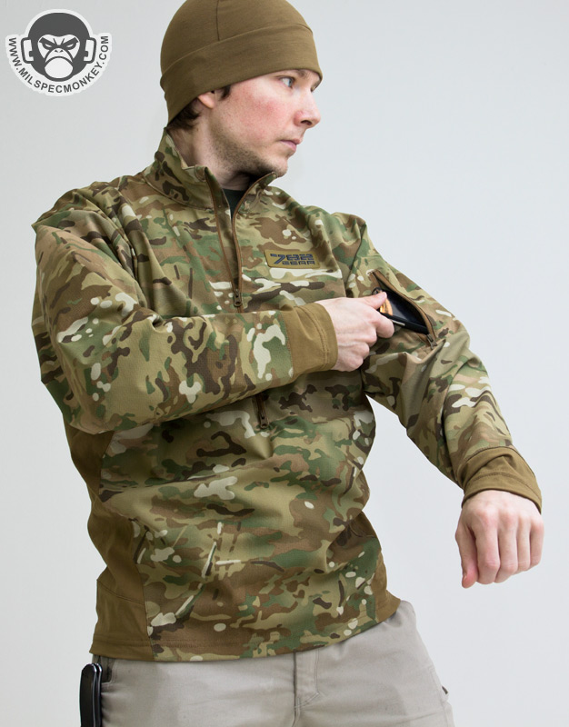 Next up, the Flash-Lite FR BAC ¼ Zip which sports a design to be worn with armor on top. Comprised of CYBERKNIT 9.5 oz. jersey and 5.5 oz Polartec Power Dry FR jersey mesh, this gives Flame Resistance to the exposed parts (shoulders and arms) while giving anti-microbial protection / moisture-wicking to the covered torso areas. The result gives durability for the combat environment with cooling assistance while wearing armor. For those not familiar with this type of setup, any little bit helps when you are sweating your ass off in the desert. A low profile zipper allows adjustment of the collar area ranging from full relaxed to all the way up, giving a mandarin collar effect. Like with most collars of this type, they feel a little funny at first since touching your chin, however it doesn't take long to get used to. The overall shirt length is good, giving plenty enough to tuck into pants without being overkill and bunching up down there. Movement freedom is great likely thanks to both the layout and the stretch qualities of both materials. Since simplistic the BAC is fairly lightweight, but some users will miss features such as pockets or adjustable cuffs. 782 tells me they do have plans to add on some loop velcro fields for unit patches and such. Despite being fancy pants materials, the BAC is overall comfy and feels very cotton like.