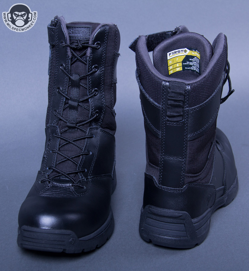 Starting features to make the zipper functionality actually work right includes using a premium YKK zipper and self locking slider. The zipper won't want to move unless the tab is pulled and is further secured with a hook and loop cover strap. Although First Tactical makes non waterproof version for a bit less, this particular version is waterproof which is a nice plus. Using a mix of 45% full grain leather, 20% PU covered leather, 35% synthetic and waterproof membrane lined construction the result is a boot that keeps your feets nice and dry. One needs to be reasonable and they aren't going to protect you from water slogging through a knee high river, but they have held up great wrecking through rain, puddles, and of course wet terrain.