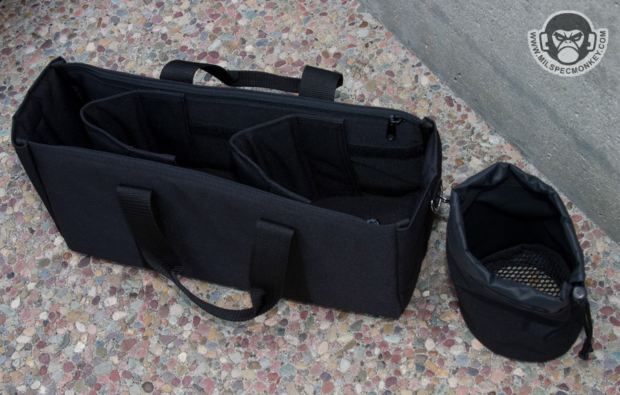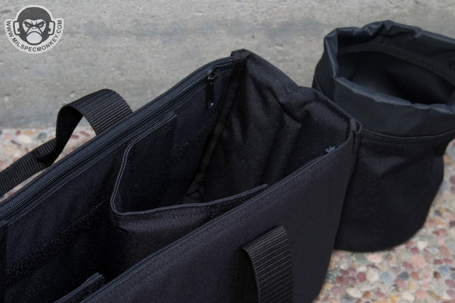 Starting with the front are 2 large square pockets. The right end has a similar pocket and a bonus ID area. On the opposite Left side is a slightly smaller rectangle pocket and a bottle holder. The back has a large rectangle pocket with a long sleeve and sleeves to put up to 8 magazines or similar items. The main flap is a dual zipper flap which lets you open it up quickly and get to your goods unobstructed. On the inside of the main pouch are padded dividers on the front and back walls. As a nice bonus, a "tote" bag is included which fits well in the main pouch. The tote was designed for ammo and brass in mind, but could be used for many purposes. The tote itself has adjustable velcro dividers and long zippered pockets along the walls. Attached to the tote is the removable brass bag which uses a standard cord-lock closure. The shoulder strap has a nice arc that is comfy to wear, however the snap hooks are pretty low speed plastic. From first impressions the dinky snap hooks are the only con I see so far. If one really loads this bag up with guns and ammo it will weigh quite a bit so I'd recommend going for full metal snap hooks. I've handed this one off to one of my SF buddies to beat up on. I'll keep you updated with hopefully some range pics.