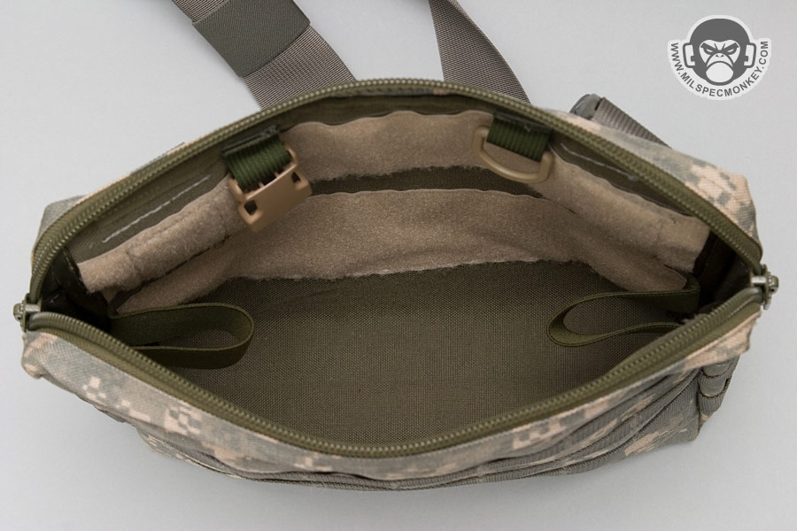 The murse makes for a great platform to customize your own small go bag. Although the bag is a little slim looking, PALS webbing is on the front and sides to expand as you wish. On the inside, both sides are covered with velcro to allow further pouches and dividers to be added. Velcro holsters, mag holders, pen holders etc. can be obtained through Esstac. The sides have big elastic loops to assist in separation for items like water bottles. As a bonus touch, the interior back has a D-ring and SRB for connection points. The shoulder strap is removable using two 2" SRBs. These can be a little noisy and clunky sometimes, but serve their purpose well for strength yet removable. I hope to add more pictures soon showing pouches added.