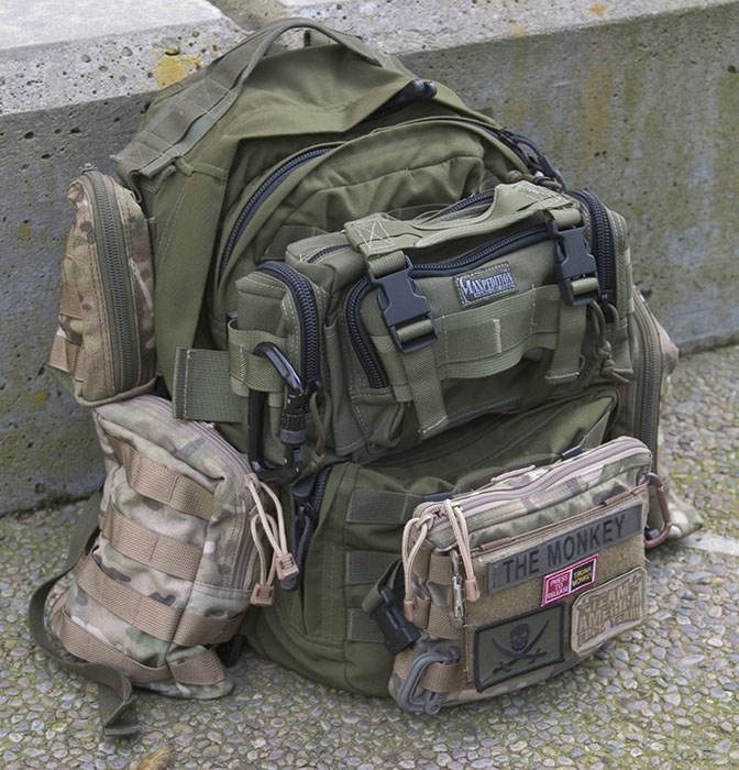 *Last pic update: Got rid of that Maxpedition Proteus and put on Emdom's Fattie WL. The Proteus just couldn't hold anything I wanted, but the Fattie really adds the extra space I was looking for. Carrying such great hits as: A loaf of bread without smashing, A big pile of mail, or a full change of clothes.