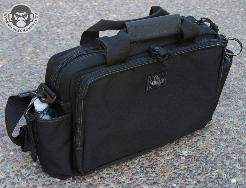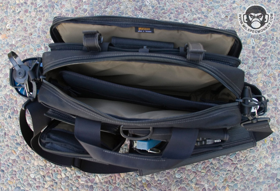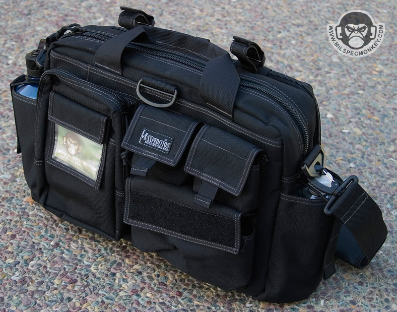This bag is similar to the MPB, but is geared more towards tactical needs. One side has multiple pockets for tactical goods, while the other is a large pannel for slimmer items. The panel only zips down halfway so the flap will not touch the ground like the MPB. I feel the small SRB in this pannel area is unnecessary, but you can always cut it off if you have the same feelings. Behind the multipocket side is a sneaky large and slim pocket which the D-ring assists in opening. This area has loop velcro for accessories making it a great place for CCW. The back and front pockets are similar in which one is for a radio and the other is for a Nalgene bottle. The Nalgene side has a grommet on the bottom is one way to tell the difference. The main compartment is slimmer than the MPB and uses a more classic zipper opening. Inside is space that can be divided by the velcro panel. One side of the panel is sleeve pockets while the other is loop velcro to hold accessories such as the modular holster and mag holder. The panel itself can also be adjusted or taken totally out. The main area can hold a 15"+ laptop (screensize). A snap loop is on top to allow one to secure the main and or side panel compartment zippers. A shoulder strap is standard with a velcro adjustable and removable wrap. As a slight con the hooks are plastic, but are holding up so far. A beefy strip of non-slip material on the bottom keeps the bag grippy and water resistant. Currently available in Black, OD Green, Khaki, and ACU. A nice ride for a bag so far, but the beatings will continue.