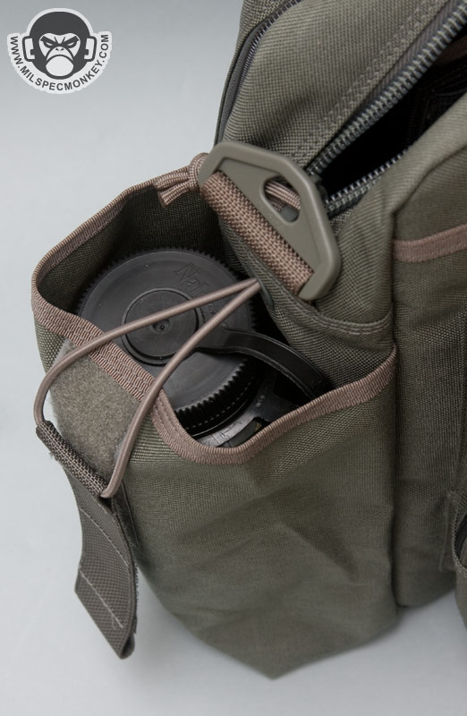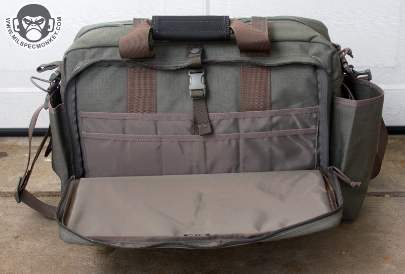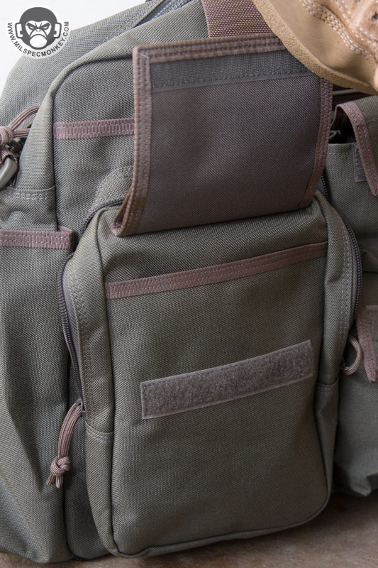 The opposite side is one big double zippered area that unzips down most of the way, but not a full clamshell style. A snap loop is nearby to secure these zippers if desired. The flap itself is padded with a loop velcro area on the exterior and the interior back is an organizational sleeve fiesta. This area is great for holding paperwork and writing utensils, but hell if you wanted to you can fit a smaller laptop in here. Above this large pocket are some velcro loops that I guess are used to hold beatsticks and large flashlights. Since I use neither they kinda get in the way of the zippers by getting in the way of the handle so I plan to cut them off. The ends of the Aggressor have large tube pockets, one optimized to hold a water bottle and the other for large radios. One can mix and match as they wish, but the hydration side appropriately has a grommet for drainage and a thicker bungee flap. While down there it can be noted the bottom of the core bag has non-slip material for grip and enhanced water protection.