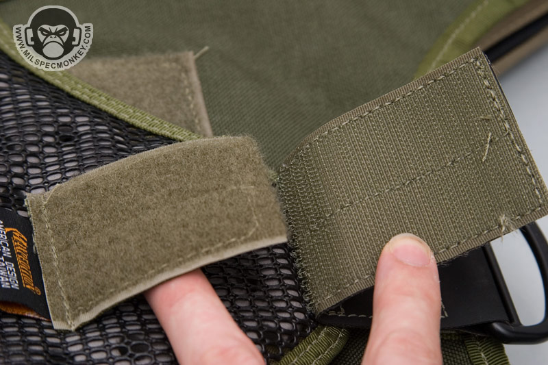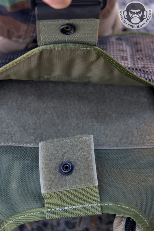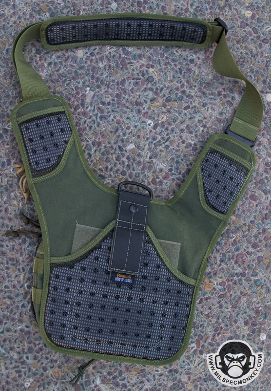 The adjustable shoulder strap has one female and one male side and comes with a removable shoulder pad. The pad is similar to the old style with velcro flaps, but the bottom now uses the foam with rubberized nylon grid. The connection points back on the actual pouch have elastic loops which are great for having over the SRBs to help prevent accidental opening. If one does not need this and wants easier operation, they simply push SRB out under the elastic and let it rest on top.