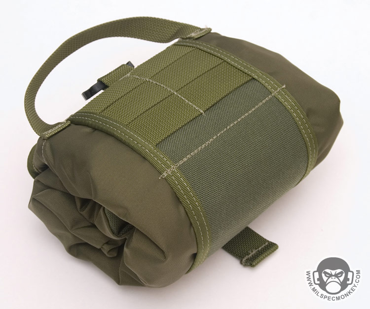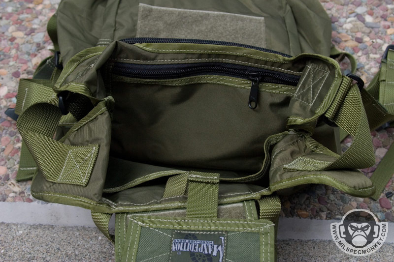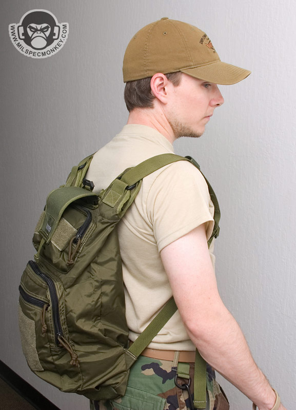 Like the normal the backpack version, most of the pack is made of 420 D material while the base (PALS area) is 1000 D. As usual the main flap uses a velcro closure and the back has PALS for 2 short malice clips with a sleeve for belt mounting. A siamese clip is on top for extra mounting options. A simple carrying handle has been added that is accessible when packed or deployed. The backpack straps now include a sternum strap and are connected to the pouch in a manner to allow expansion when filled. The other big addon is the smaller external pockets. Once expanded into a backpack, there is a lower square-ish zippered pocket and a higher rectangle zippered pocket. The lower one actually has another thin zippered pocket on it and a loop velcro area. The larger part of the lower pocket has a divder sleeve close to the front and a plastic lanyard. The higher rectangle pocket doesn't have anything special inside, but has loop velcro on the exterior which is what the main flap attaches to. Speaking of the main flap, a loop velcro area was added so one can easily get the flap out of the way when putting items in and out of the pack. I hope someday this feature is added to all Rollypolys. Moving to the interior, there is a webbing loop up top for hanging items such as hydration bladders and a built in hydration sleeve to hold up to a 100 oz bladder. On the other side of the interior is a slim zippered pocket. When totally filled up the whole pack holds about 500 cu.