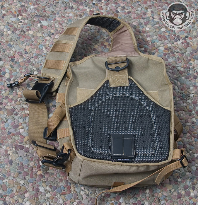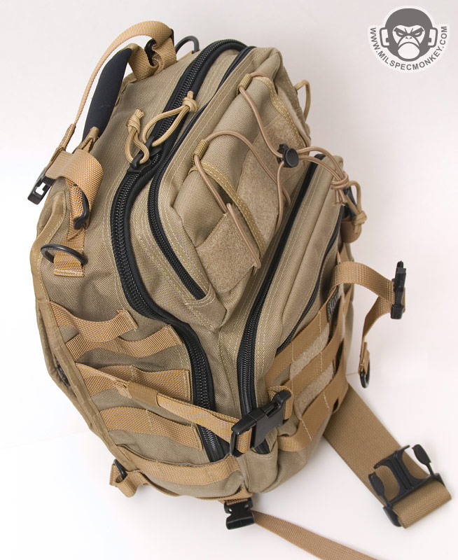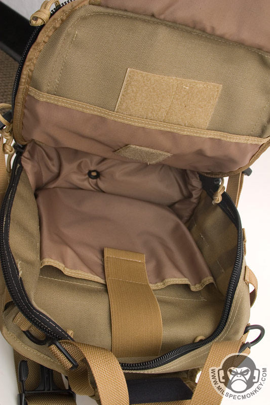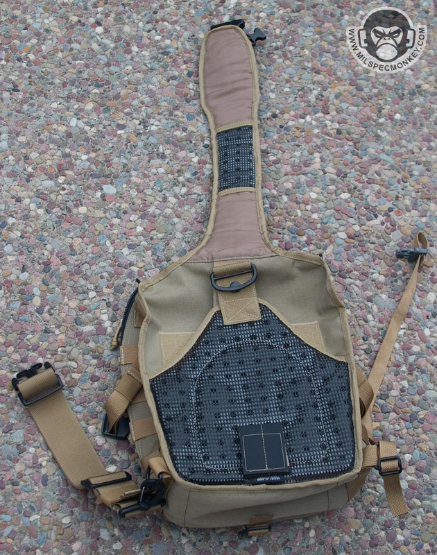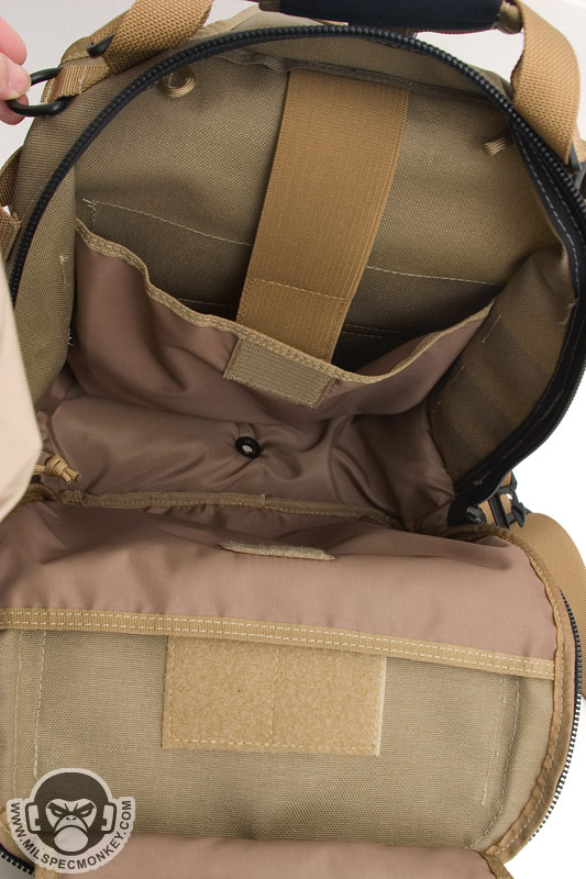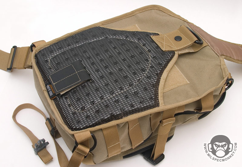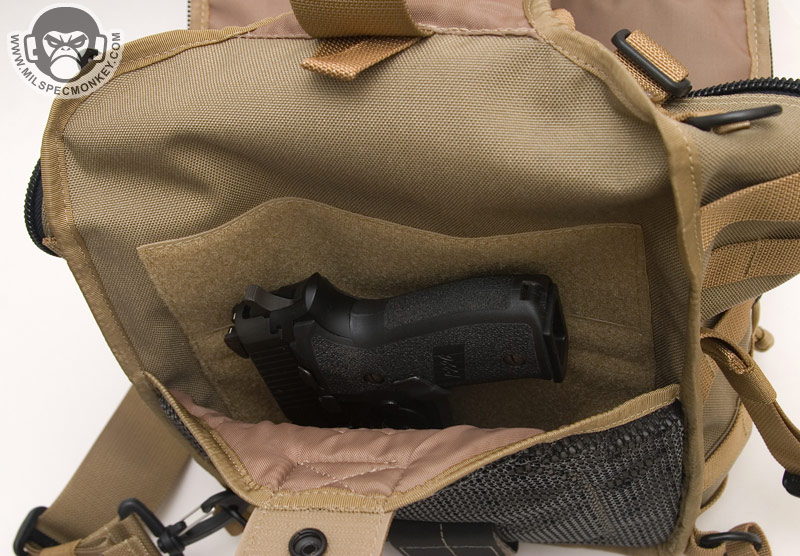 The front lower pocket has received a lot of upgrades. Starting with the outside, there are PALS loops of 3 rows x 5 columns in which the middle column is long. This allows for a good amount of space to addon a couple of pouches or a bigger one like the TacTile Large. In between the PALS are bonus 1" loop velcro strips for name tapes and the Maxpedition logo is even on the webbing out of the way, sweet! The inside of the front lower pocket has drastically changed from the Lunada which has more mesh now. The back side has a tall sleeve pocket with a mesh sleeve sewn on top divided into 2 sections. One section is about 1/3 total length and the other is 2/3 to give more holding options. The usual plastic lanyard keeper is also attached on this side. On the internal front side is a built in mesh zippered pocket with elastic loops to hold items horizontally. This zippered pocket isn't very deep for easy accessibility. The upper frontal external pocket is laid out like the Lunada, just slightly bigger. This includes a sleeve pocket in the back and elastic divided into 3 loops. The inside of the main compartment is also very Lunada-like, however now people have enough room for that ever-so common legal size paper with out folding. The inside still suffers the inner front flap dilemma which now is even bigger with 2 external sleeve pockets. Users will like it for organization or hate it for covering up their internal CCW area. Speaking of CCW, the back external CCW area is now VAST. I couldn't quite fit 2 full size handguns back there, but I could put a handgun in horizontally just to display a "cause I can" factor. I don't have one laying around, but this is likely big enough to fit a PDW inside like a MP5K or MP7. I was happy to see a large D-ring on the connection strap which is much easier to grab onto than the 1" D-Ring on the Lunada.