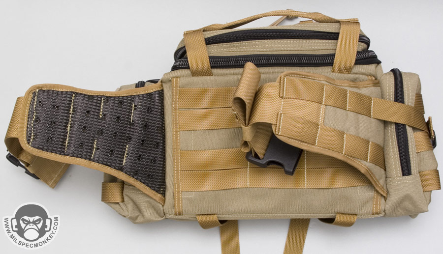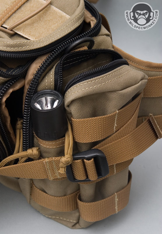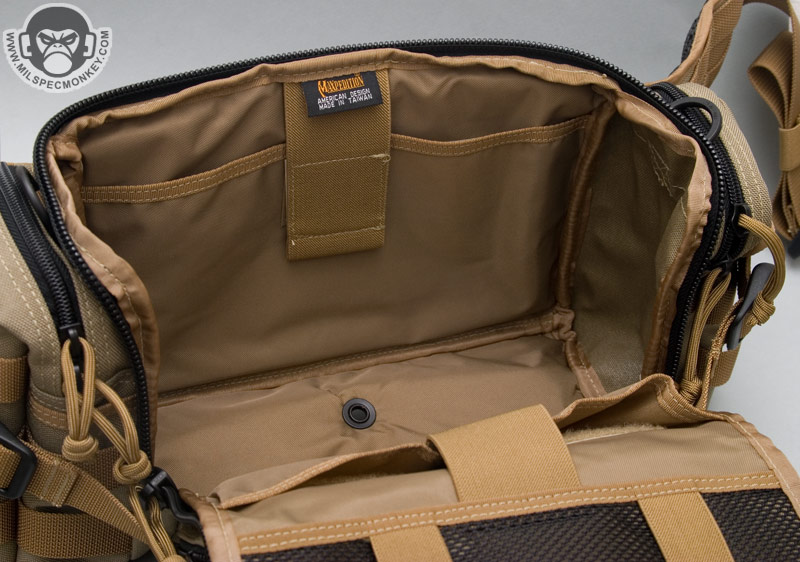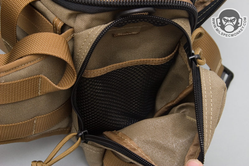 Around over on the front is a bigger than it looks double zippered pocket. The side compression straps get in the way of the zippers a little bit, but not too bad. The exterior has modified PALS webbing for channels for vertical compression straps and to allow for adding other pouches. Between the PALS is loop velcro for name tapes and smaller morale patches. The Maxpedition logo is kindly on the webbing instead of the loop like on some older products which should make both user and Maxpedition happy :) On the inner-back of the front pouch is a sleeve with a mesh sleeve on top and divided down the middle. A key lanyard is also included. Nothing is on the inner-front, but I don't see that as a big issue. If I could change it, I would like to see some horizontal elastic there.