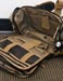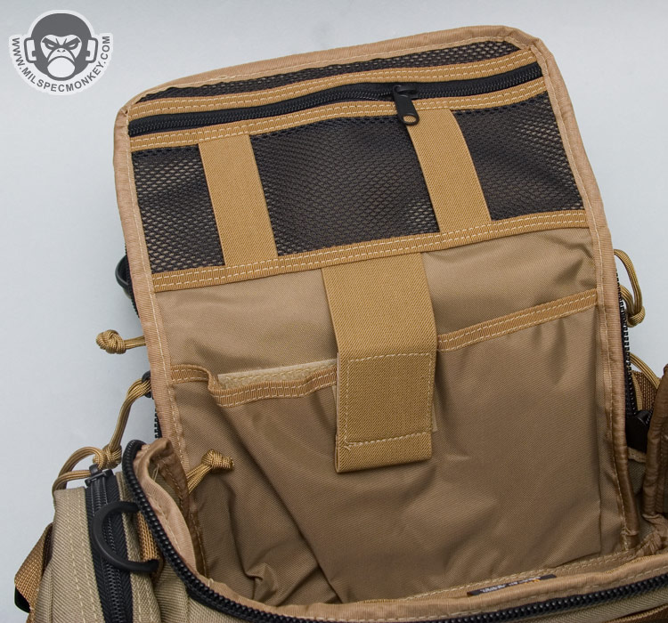 Let’s go ahead and break down all the pockets and what-not. At the very top is the Maxpedition style sleeve with shock cord and cord-lock rig. Loop velcro is down the middle for patches. The sleeve and cord allow you to ram items in there for low security, yet easy to access capability. If this area is a little more than you need, feel free to take off the cord rig to streamline things up a bit. This top area has its own pocket with double zipper clam-shell opening that folds away from the user. Inside is a sleeve with 1" horizontal elastic loops on one side and a zippered mesh pocket on the other. This is a great place for the smaller goodies.