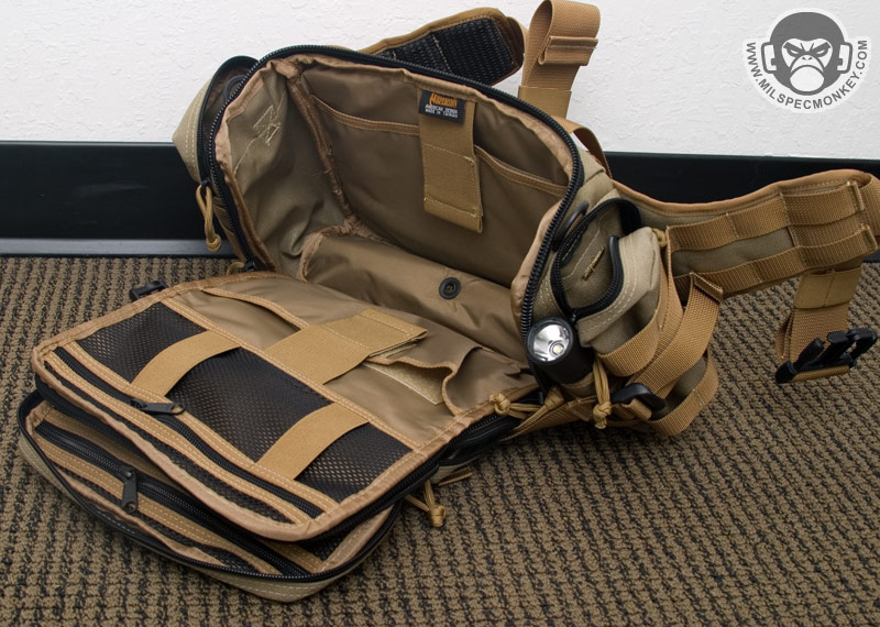Moving down is the main compartment. This also opens up with double zippers which can get a little confusing with the upper compartment zippers. I recommend trying to keep them staggered from each other to make things easier. The zippers go further down the pouch to make for a unique wide opening that allows full access without flopping straight down. This compartment also opens away from the user which greatly makes it vastly easier to use while still on your body. On the top of the inner main area is another larger zippered mesh pocket that has 2 vertical elastic loops. These are good for further slim organization and the loops work great for medical items. Inside the core pouch are sleeves with elastic velcro flaps on the front and back. Both also have loop velcro panels on the inside to add Maxpedition accessories like the 3 mag holder. Nothing else is on the sides, and a there is a grommet on the bottom for drainage. I feel this is a good compromise of organization ability without extra crap getting in the way.