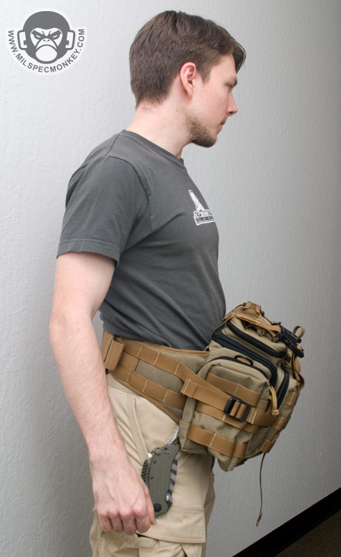 The back is simplistic with modified PALS webbing to allow use of multiple long MALICE clips to attach the Sabercat to other gear. This back panel has side access with velcro closure than can allow for the belt flaps to be tucked in to transform the Sabercat into being a bag rather than a waistpack. The belt straps themselves have nice padding with rubbery/nylon mesh on the inside for comfort and cooling and PALS webbing on the exterior for great connection point and additional pouch mounting options. If all of the belt PALS are used with new pouches, you can get quite a bat-belt of equipment storage going. The main belt connection is a simple 2" SRB, bonus elastic loops are included to hold down the extra webbing slack. The bottom of the Sabercat is simplistic, but the vertical cinch straps can be adjusted to hold other items like bed rolls down there.