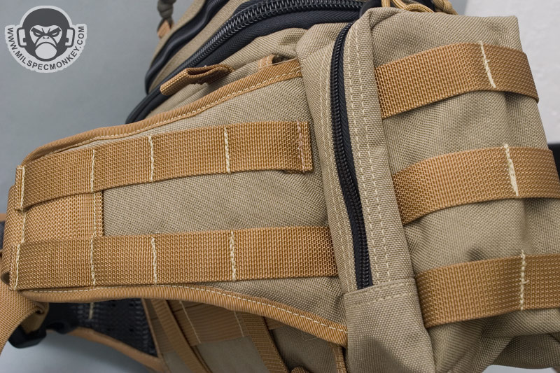 The sides have cloned medium sized pouches with double zipper access. The exterior has a good dose of PALS for adding pouches or general connection points, but the side compression straps aggressively get in the way of how far one can open these side pockets. One can open the pocket fully, but then it is a hassle to retrieve the back pull cord the due to the compression strap covering it. On the inner-back of these side pockets are simple mesh sleeve dividers and bottoms have bonus grommets. Although easy to miss, the exterior front of each side pocket has a slim sleeve good for longer items like flashlights and tools.