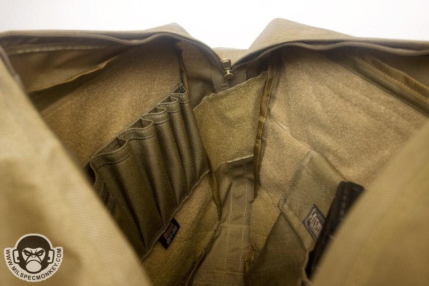 On the interior the main flap itself has a slim yet large single zippered pocket good for documents and or smaller items. The main compartment is more protected than most messenger bags including a double zipper closure with rain flaps. This causes loss of the large opening some may enjoy on classic messenger bags, however gives huge security improvements. With these Maxpedition designs, users can leave the main compartment open with the flap secured to allow fast access through the flap zipper or, have both the main compartment and flap closed for full security. For some reason the double zippers to the main compartment have no pull cords which sucks as they tend to hide under the rain flaps. This makes usage quite a hassle, but luckily is easily fixed cheaply by adding any sort of pull cords. Having rain flaps at all is somewhat odd since that is the main flap's job, but perhaps this is to allow users options to roll with the main flap open. Inside the main compartment the space is simplistic yet lined with fuzzy loop velcro goodness. The front and back is lined completely with loop giving full modular velcro pouch possibilities. As a bonus even the slim sides have some loop, enough to hold the smaller attachments. To clarify, no velcro pouches are included, but I do show some in the pics that Maxpedition offers. They add a lot of customization options rather than being stuck with just a slim sleeve and a couple pen pockets like on typical messenger bags.