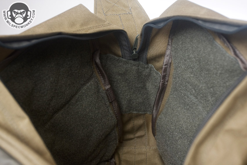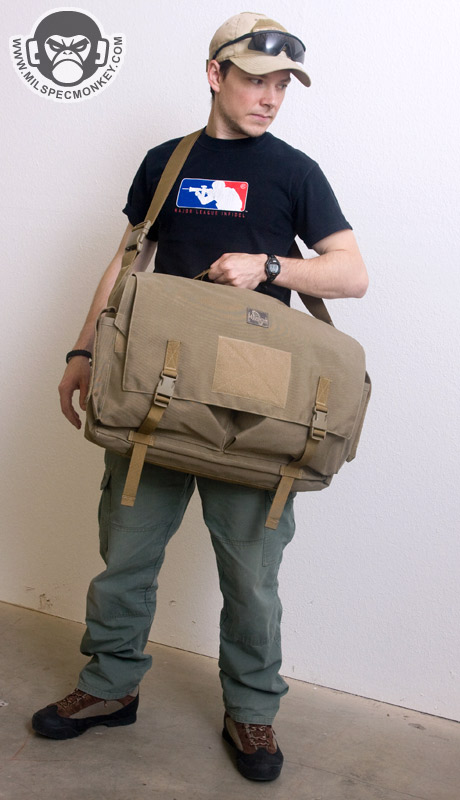Staying with the common messenger bag format, the main closure is a big ass flap that uses two 1" SRB buckles to secure. A generous amount of loop velcro is available for patches or nametapes. This setup is great for adjustability on load sizes, however kinda slow speed wise where the SRB buckles must be released or buckled when fully opening or closing the bag. To get around this classic drawback, there is a crafty double zipper on the upper back to allow quick bag access. The opening may not be as large as when the flap is open, however it works great for quick item grabs. A substantial handle is also on the upper back. Due to the placement it is more of a grab handle since when carrying it by only this handle the bag will hang at a tilt angle. The extra large piece of fabric on the back is somewhat sneaky where even I didn't know what the hell it was till I asked. Turns out, it is so you can easily mount the bags on roller luggage that have the telescoping handles. I'm kinda conflicted on the feature where it works as intended, however I don't think many messenger bag users travel with rolling luggage as well. In my opinion a simple sleeve pocket would be more useful. Also on the back is a 1" SRB waist strap setup that is good for securing the bag during movement. It is modular so can be removed if the user feels they will never use it.