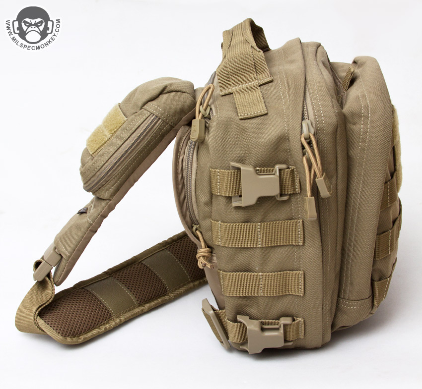 When it comes down to actually using the MOAB 6, I find it to be an interesting hybrid. It has the qualities of modern single strap tac-based packs, yet the size is more man-purse ish due to the cube dimensions. The ease of use while wearing won't be quite as easy as a more traditional shoulder bag, yet is still certainly possible and then gives much better mobility when returned to the back mount position. By mobility I mean being able to haul ass without your pack bouncing all around and not just take a mere waltz in a park. Thus based on those attributes I think it makes a great grab and go bag where the user is generally mobile and doesn't necessarily need to access the pack constantly throughout a day. Keep in mind the ability to rotate the pack from back mount to front mount (and reverse) is still great, just all your stuff inside will be sideways on a front mount which may or may not be what you want. I think it is cool the tier connection system is integrated by default to allow mounting between the MOAB and RUSH series. Some may be turned off thinking it makes your pack load have too much stick out depth, however it makes great sense for those on specialty missions where they have a large pack for longer term sustainment and also a smaller pack ready to go for an assault, recon, patrol, or what have you where a lighter load is preferred. The new Sandstone color is a big improvement over the old RUSH series brown (ahem orange) color and looks great around both Multicam and Marine Coyote.