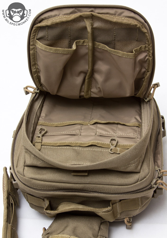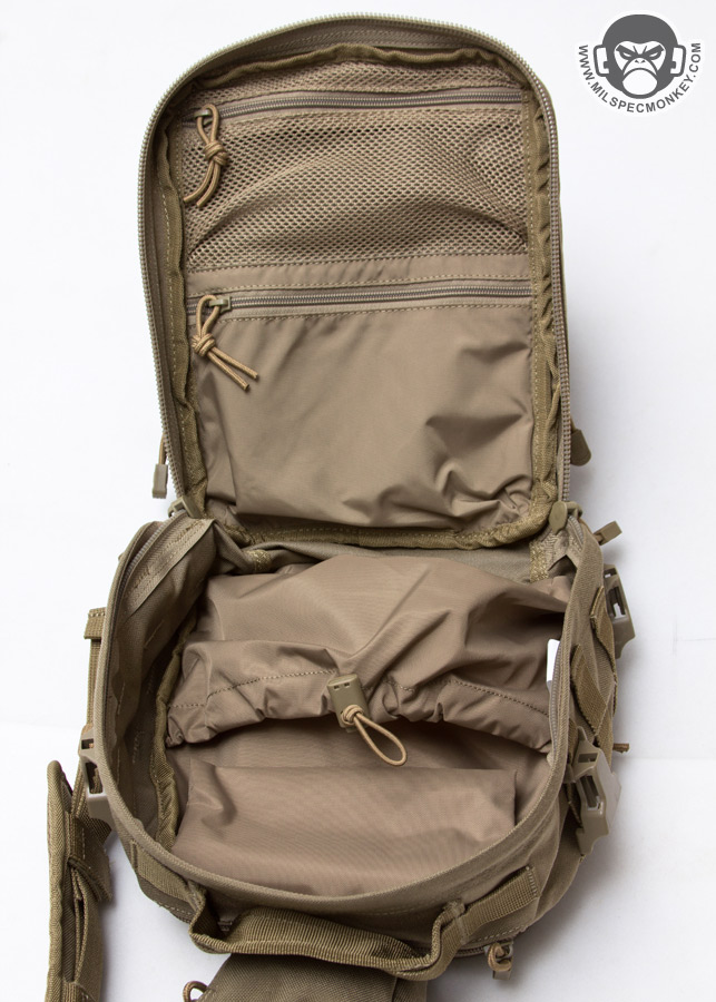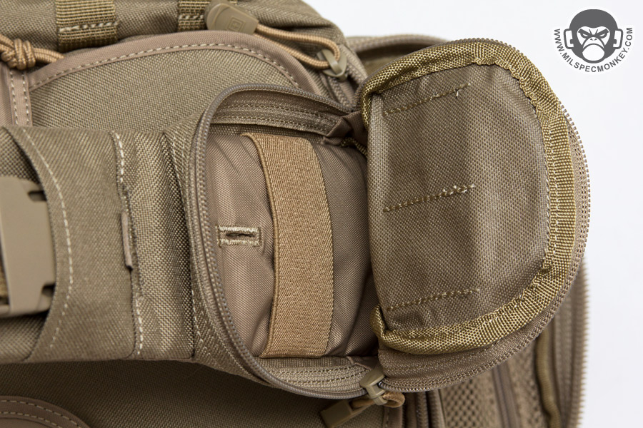 Over around on the front is a substantial sized pocket opening with 2 zippers to not quite the bottom to help keep the flap upright when open. The interior is a sleeve pocket party with many on the back side to hold a variety of slim item sizes and writing utensils. There are not 1, but 2 key keepers to give more holding options and accommodate side preference. On the other side are 2 large sleeve pockets which appear to be made with rifle magazines in mind. There is a big seam down the middle which comes off as an interesting construction decision. If I had to guess, it does help separate the sleeves from each other to prevent item banging. All these sleeves come in handy whether it be for medical gear or just a lot of random nick-nacks. The main compartment also opens up with 2 zippers, as a tangent the pack seems to vary between having the cord ends be a knot or a plastic piece. I'm a fan of knots as they don't really ever break, however each user will have their preference. Back on subject, the main compartment opens up to a very near clam-shell opening to allow quick full access. On the interior back you'll see the sunglasses pouch, ignore that for now as the opening is on the exterior, but under it is a large sleeve pocket with depth and integrated shock cord to tighten. This works out nice for sectioning off medium sized gear while still having it be easy to access. On the other side are 2 single zippered pockets, one being mesh and the other being the usual lightweight interior material. My first reaction is that double zippers would be nice here for the whole ambidextrous thing, yet I can understand that would eat away at the pocket opening length. I think the sizing on these pockets work well to give solid organization options.