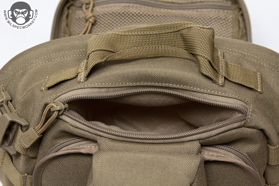 Up top is a solid drag handle to carry the MOAB 6 in hand bag mode or to assist on pulling the pack out of storage. Nearby attached to the portion of the shoulder strap that is connected to the pack is a small general purpose pouch. The exterior has 3"x2" of PALS webbing with loop velcro which will likely see a lot more patches than pouch additions, yet do work out good for holding pens. The GP pouch opens with a single zipper and the inside has 1.5" elastic inside to hold electronics such as music devices, slim phones, and cameras. A wire hole is integrated to use with headphones or maybe you can get crafty with comm gear. The hole appears to lead to no where when actually the whole GP pouch is only connected to the pack on the sides creating a tunnel behind it; not only good for the wire routing, but can get into knife storage as well. Between this pouch and the handle is a small zippered pocket that uses a soft material great for sunglasses, yet also good for small electronics. The way it is constructed has small holes on the corners, not sure if for more wire routing options or just for manufacture ease. In the back area is a hydration type pocket that also can work just fine as a pistol storage area since padded. The double zippers are in an alternate configuration so when closed there is a zipper pull on each side which I think is pretty cool. The inside is plain with 2 sneaky hanging tabs integrated up top. So sneaky I missed them in my photos. Unfortunately there is no port for a hydration tube so one would just have to make do with the zippers if trying to use this pocket with that kind of bladder.